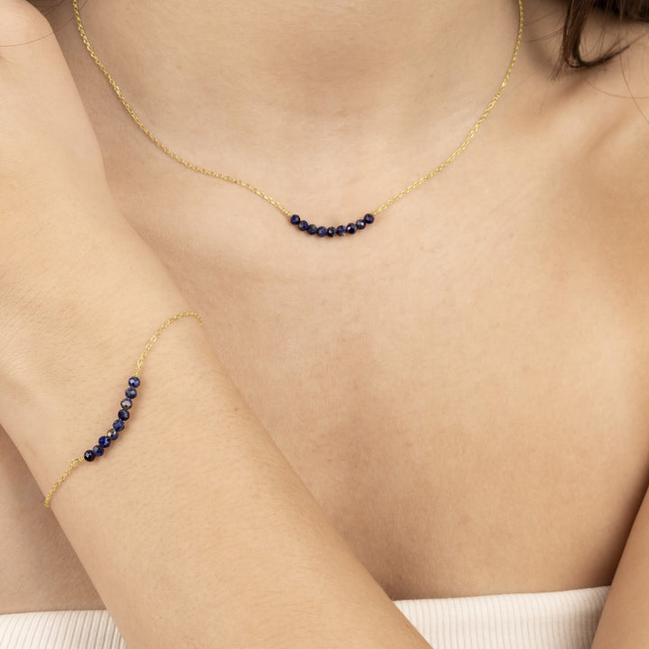 Blue Lapis Beads Bracelet in Gold by Gold Trip is a contemporary and delicate accessory that adds a splash of bold color to your wrist. It features nine faceted Lapis Lazuli stones, which are hand-strung onto a fine link chain. The faceted stones add extra sparkle, making this bracelet a perfect piece to wear alone or layered with other bracelets. The chain is crafted from hallmarked sterling silver and plated in 18ct gold, with an adjustable length for a perfect fit.