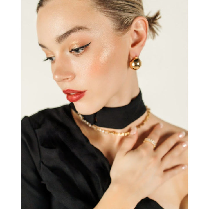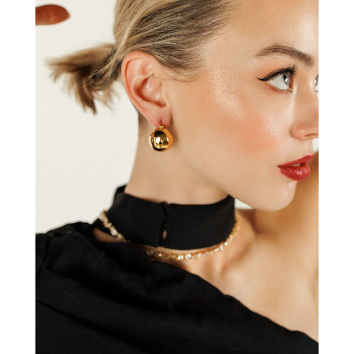 These earrings are crafted from high-quality 18k gold-coated brass. They feature a bold dome shape and a pushed-back closure. They are hypoallergenic, waterproof, and non-tarnish.