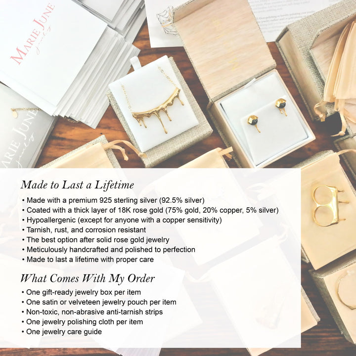 Handcrafted in sterling silver with a thick layer of 18k rose gold vermeil. Hypoallergenic and tarnish-resistant. Includes post backs. Made in the USA.
