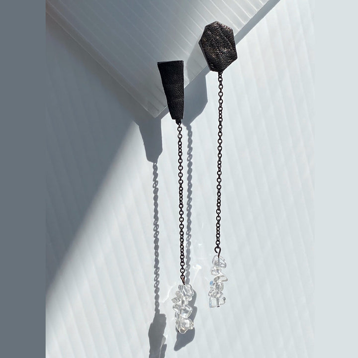 These earrings are crafted from leather studs, a stainless steel chain, and clear quartz crystals. The clear quartz crystals are a natural material.