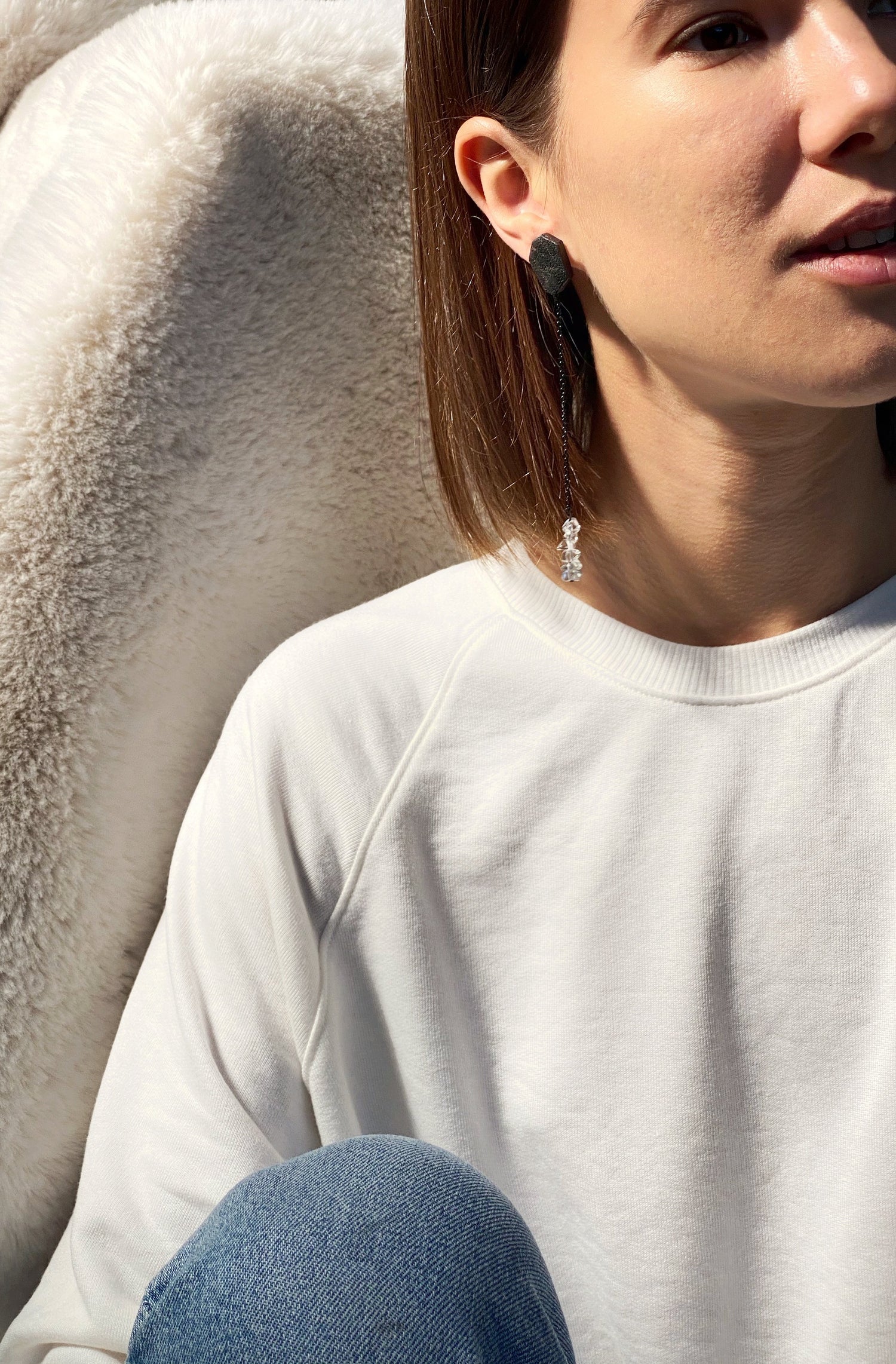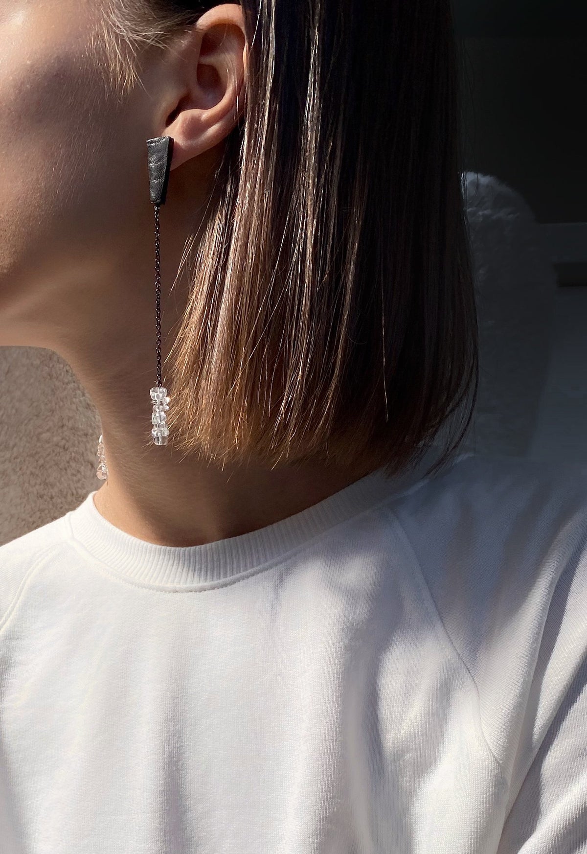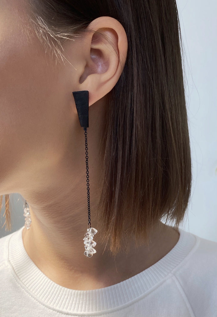 These Leather Drop Earrings With Clear Quartz by Waiwai are a unique and artistic accessory that combine the raw beauty of natural materials with a modern, asymmetrical design. These earrings feature leather studs, a stainless steel chain, and clear quartz crystals. The clear quartz is a powerful stone known for promoting clarity, awareness, and positive energy, making these earrings more than just a fashion statement—they are a talisman for enhanced perception and inner strength.