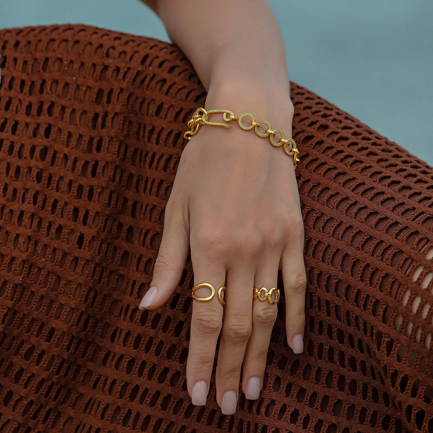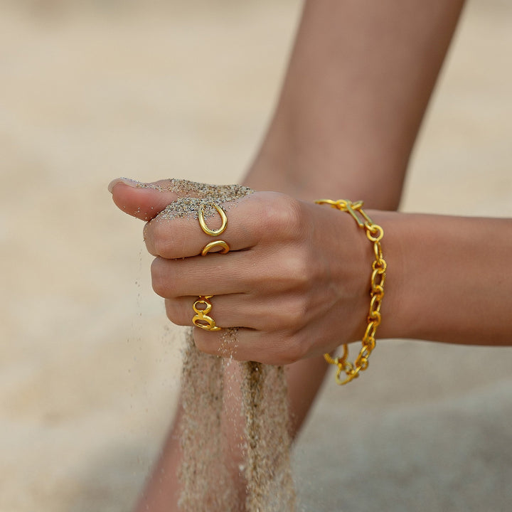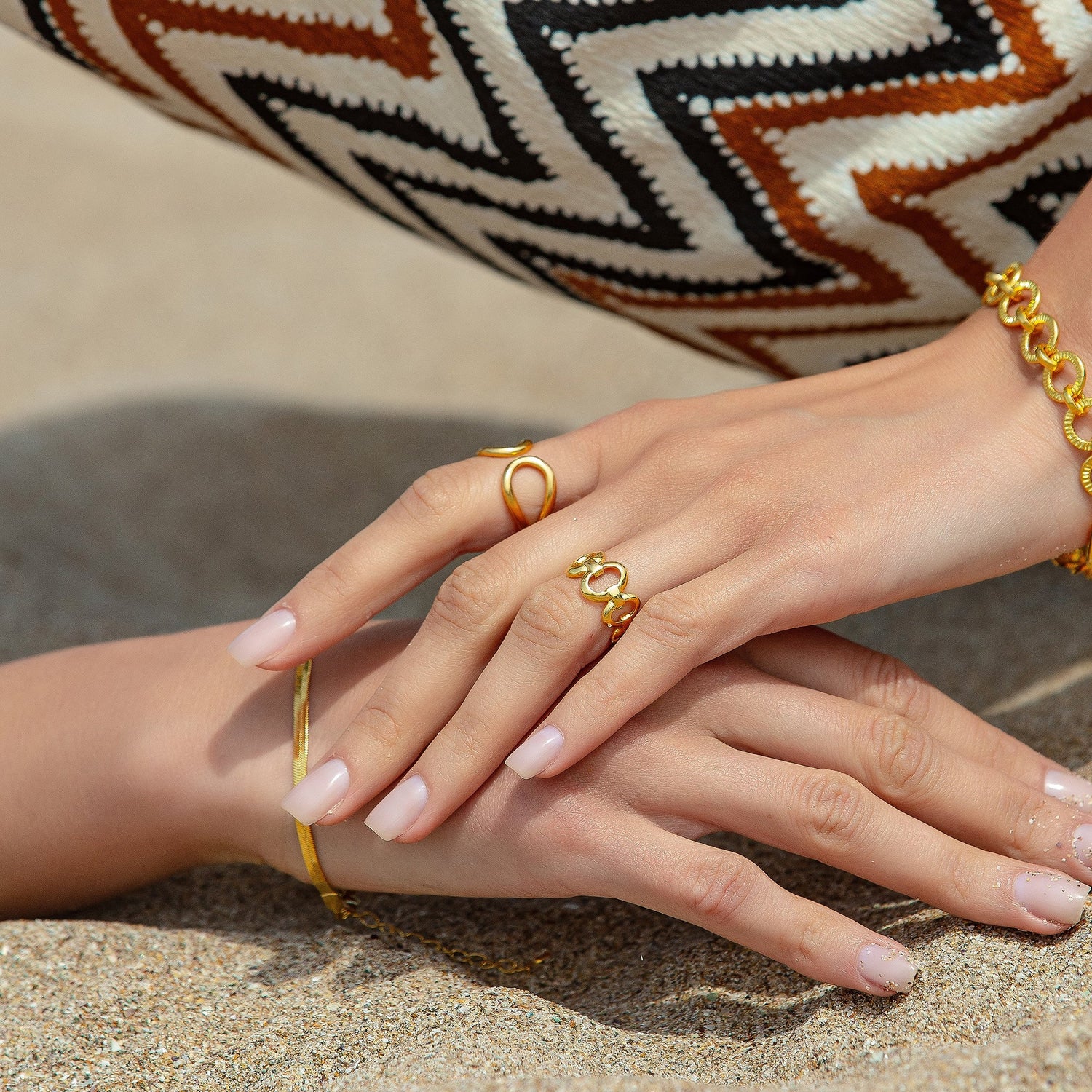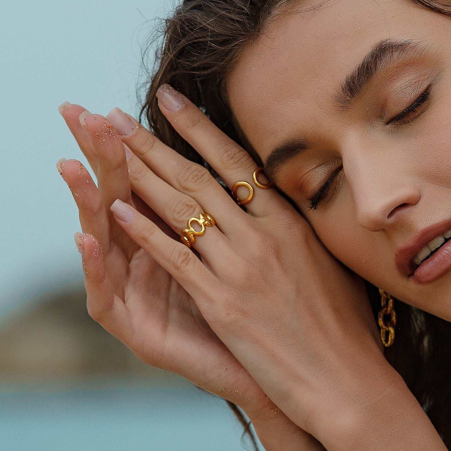 This Chain Link Embrace Gold Plated Ring by Mejoma is a quirky and versatile accessory that adds a playful touch to any outfit. The unique chain-link design creates a comfortable and effortless fit, making it a perfect statement piece. This ring is a confident way to wrap yourself in style and stand out.