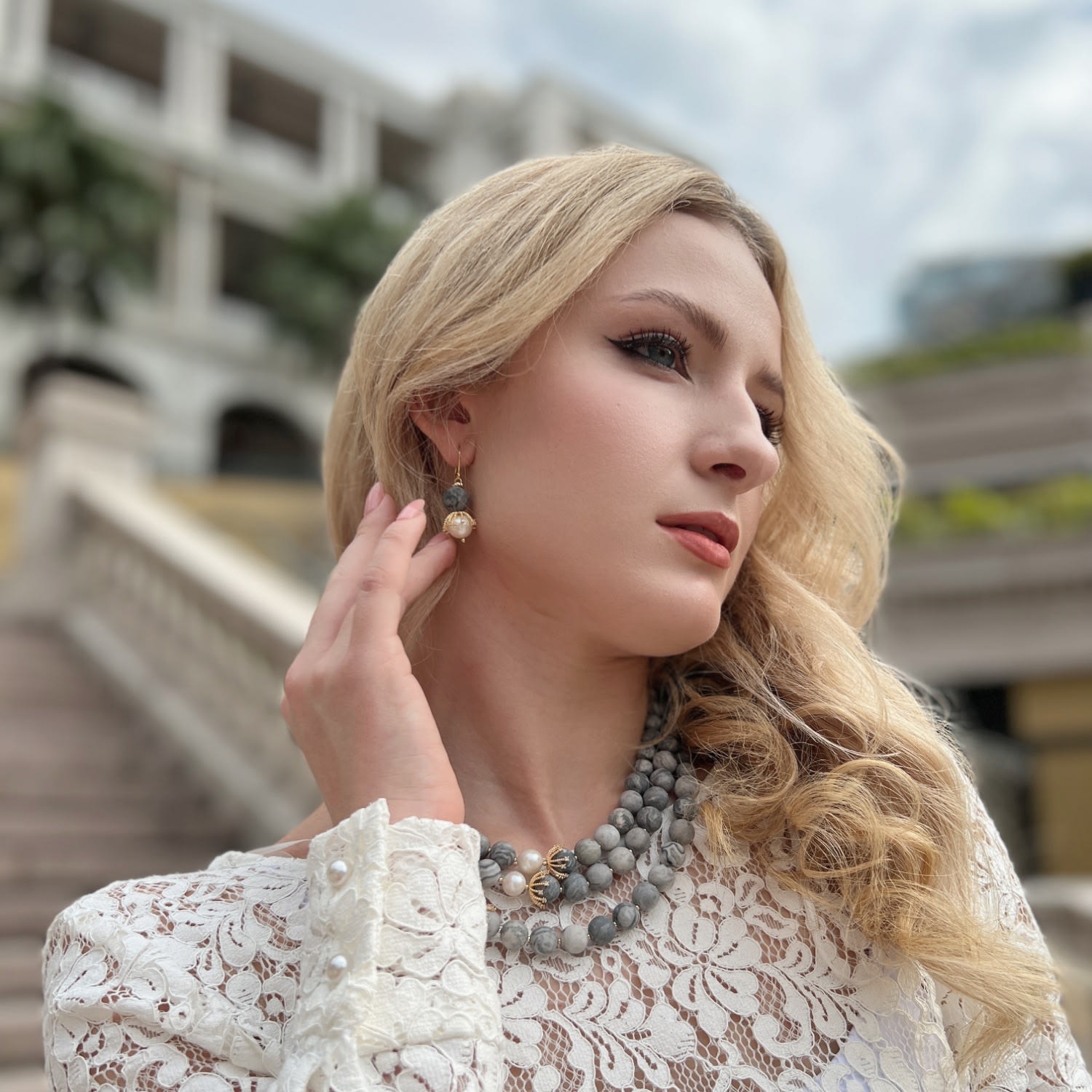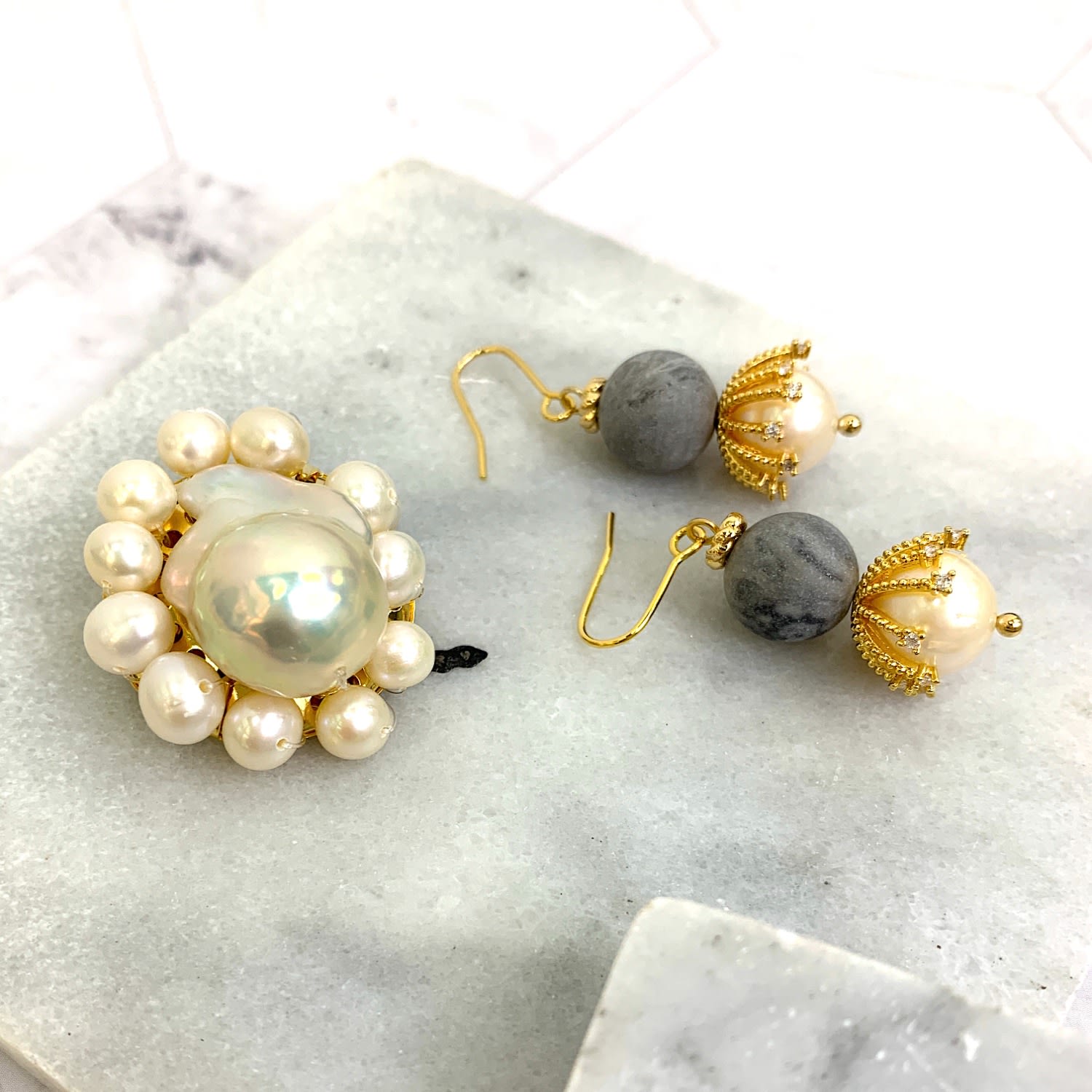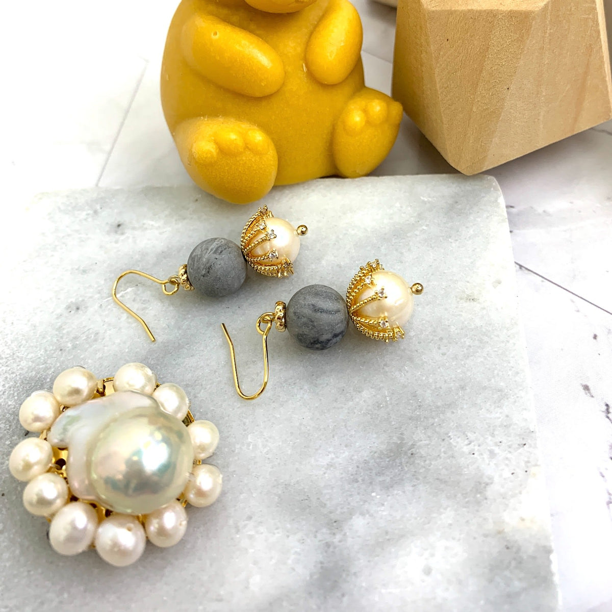 These earrings are handmade with gray agate stones and freshwater pearls, and are crafted with Japan golden-plated brass findings.