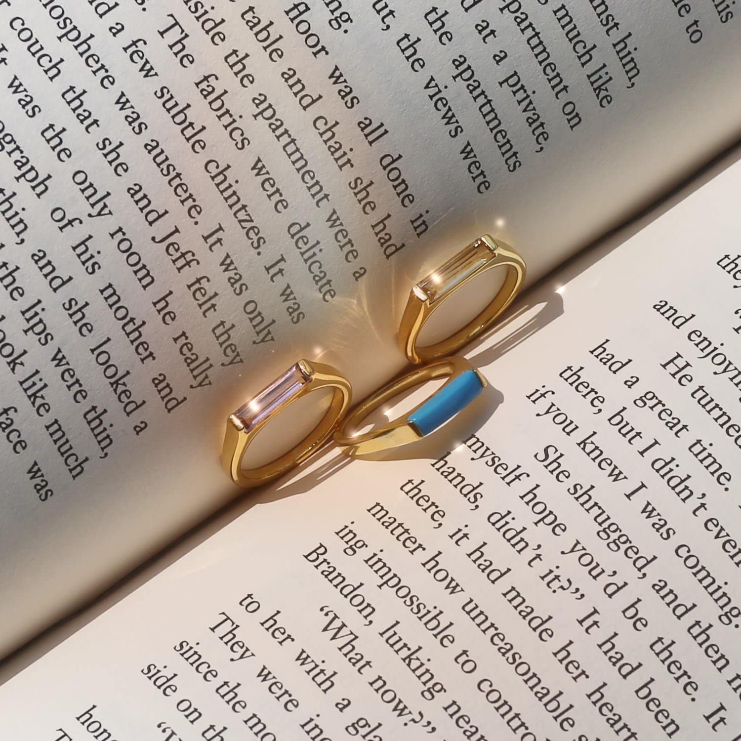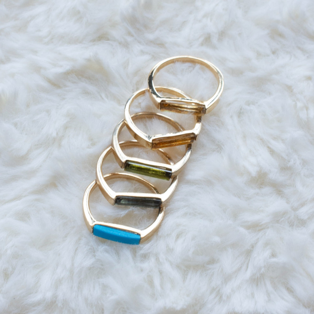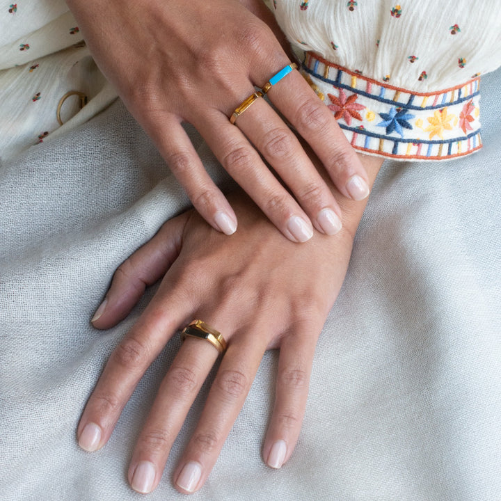 The Emma ring by Preeti Sandhu is a slim and minimalist stacking ring with a clean, architectural sensibility. Handcrafted in 14k gold-plated sterling silver, it features a half-bezel set natural citrine stone that highlights its warm and glistening color. This ring is perfect for wearing alone for a subtle statement or stacked with other rings for a layered look. It's a versatile piece that complements both casual and formal ensembles, symbolizing understated elegance.