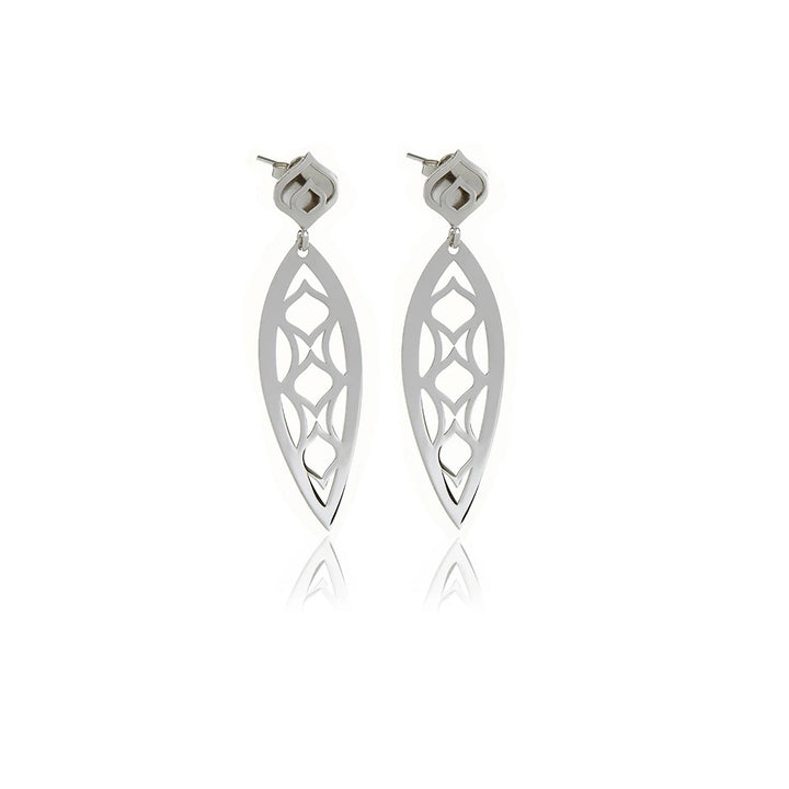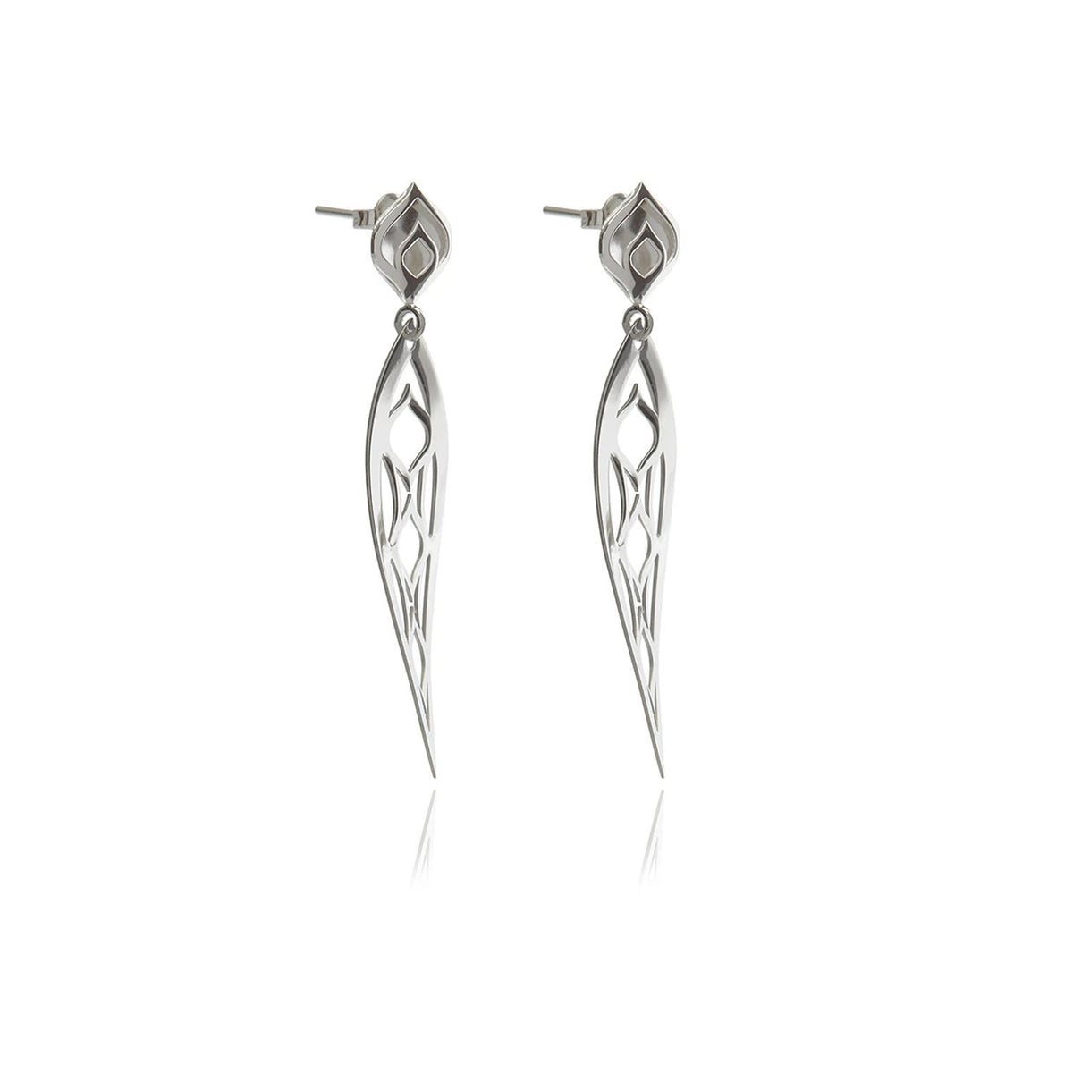 These earrings are crafted from sterling silver with a rhodium plating. They are lightweight and feature a single leaf motif with a chandelier line design.