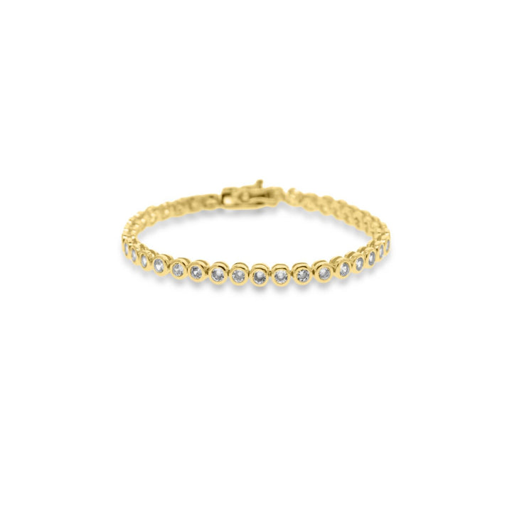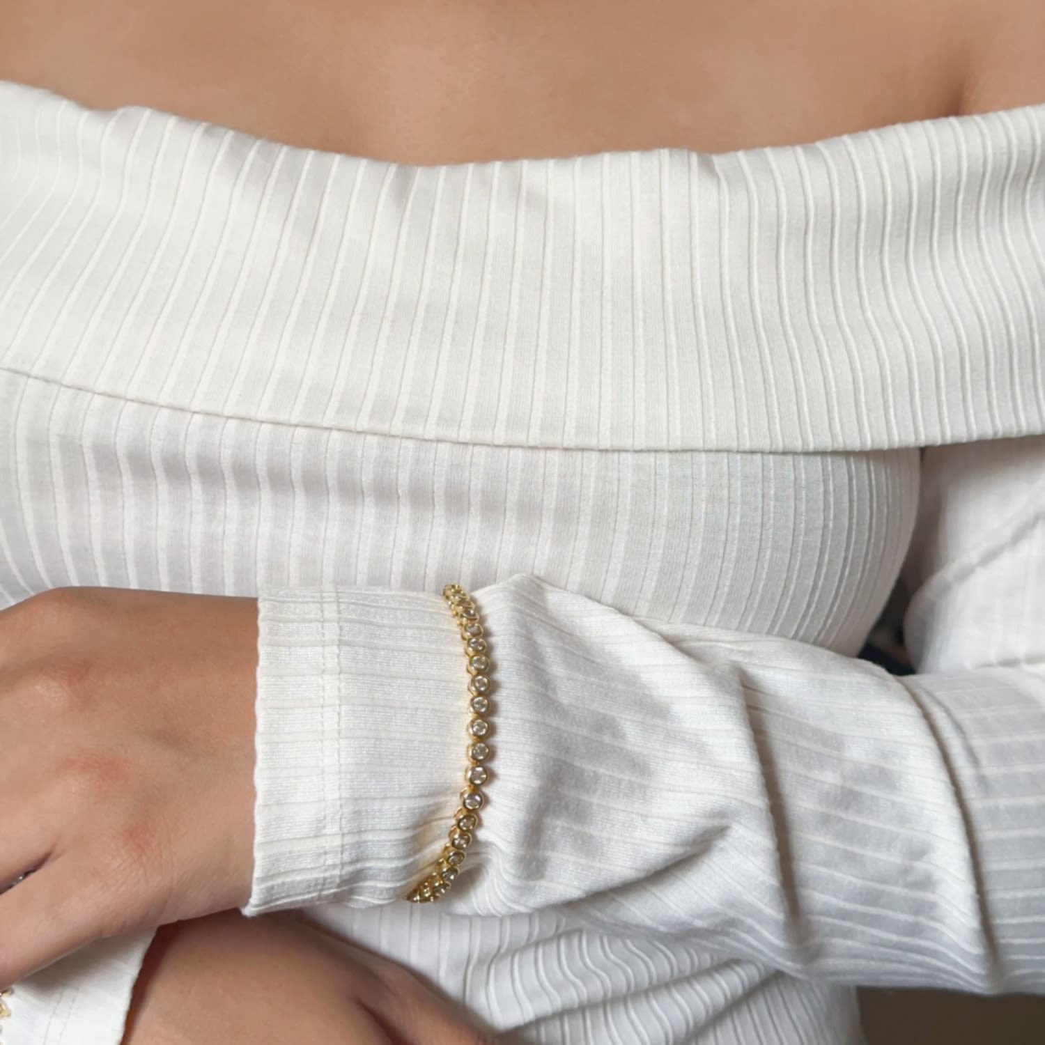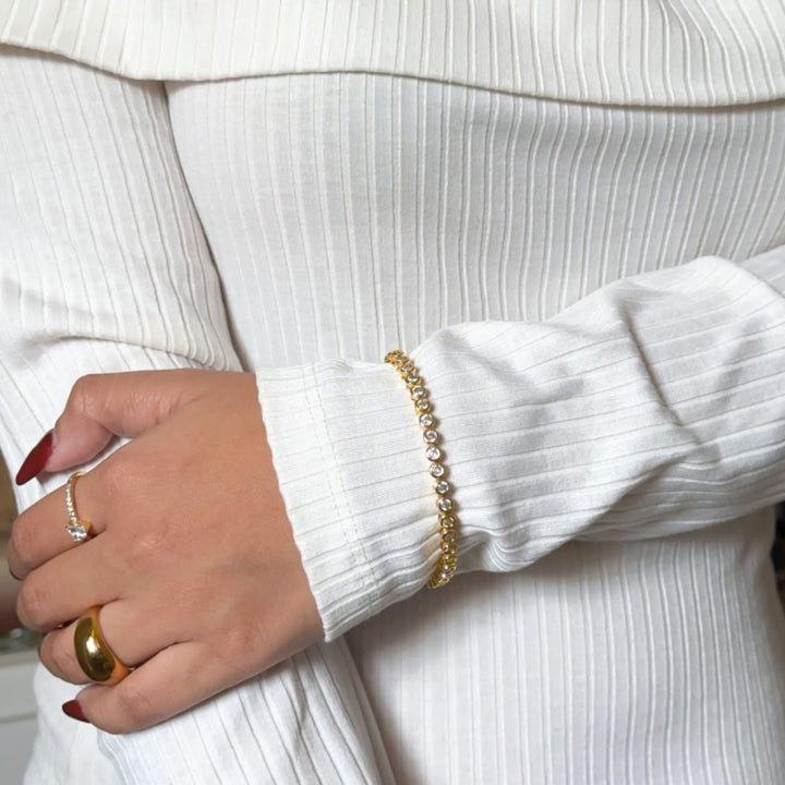 This bracelet is made of high-quality 18k gold-plated brass and features a row of cubic zirconia stones. It is hypoallergenic, waterproof, and non-tarnish.