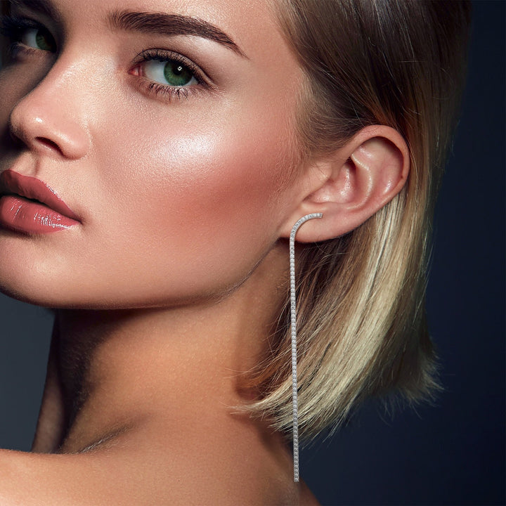 These Long Tennis Chain Dangle Earrings by Meulien are a stunning blend of classic elegance and urban chic. They feature a single, slim tennis chain set with clear cubic zirconia stones that dangles gracefully from the earlobe. The minimalist arc shape on the earlobe adds a modern touch. These earrings are designed to be a sophisticated statement piece, exuding casual glamour and movement. They are perfect for adding a touch of sparkle and a bold, elegant line to any look.
