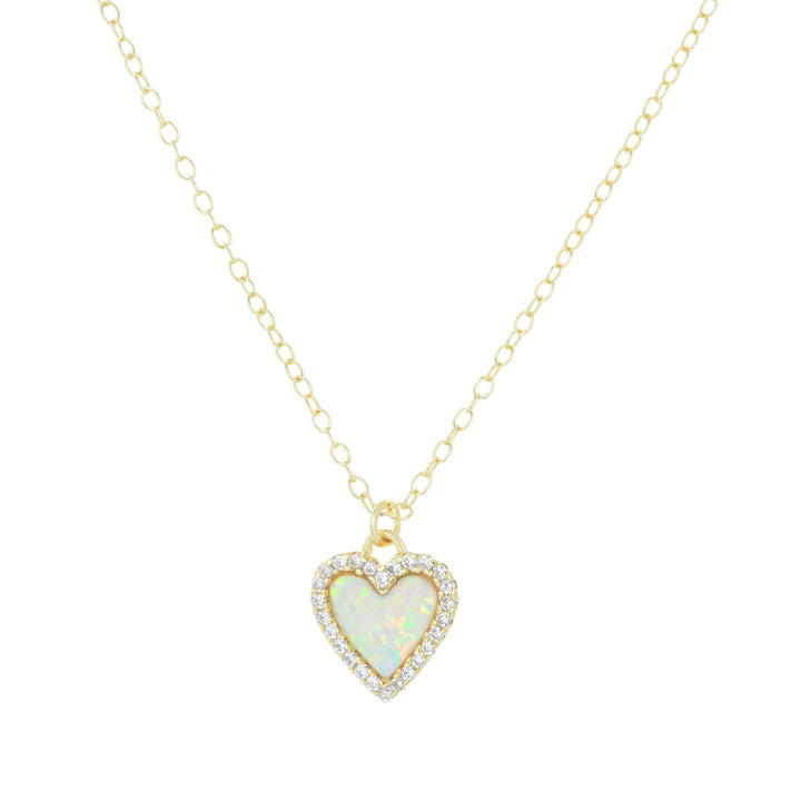 This necklace is made with 925 sterling silver and is gold-plated. It features a lab-created opal heart and crystals. The dimensions are 9mm and the chain is adjustable up to 18 inches.