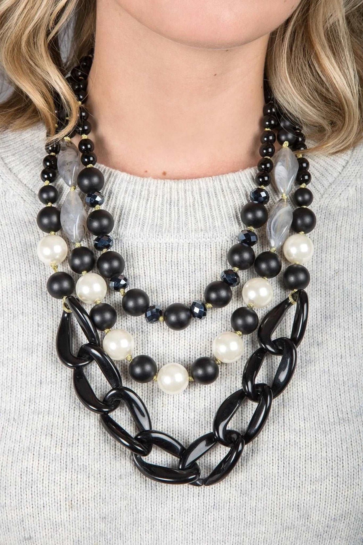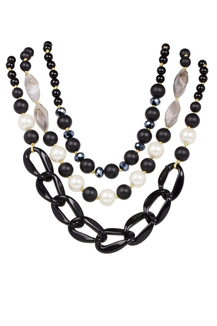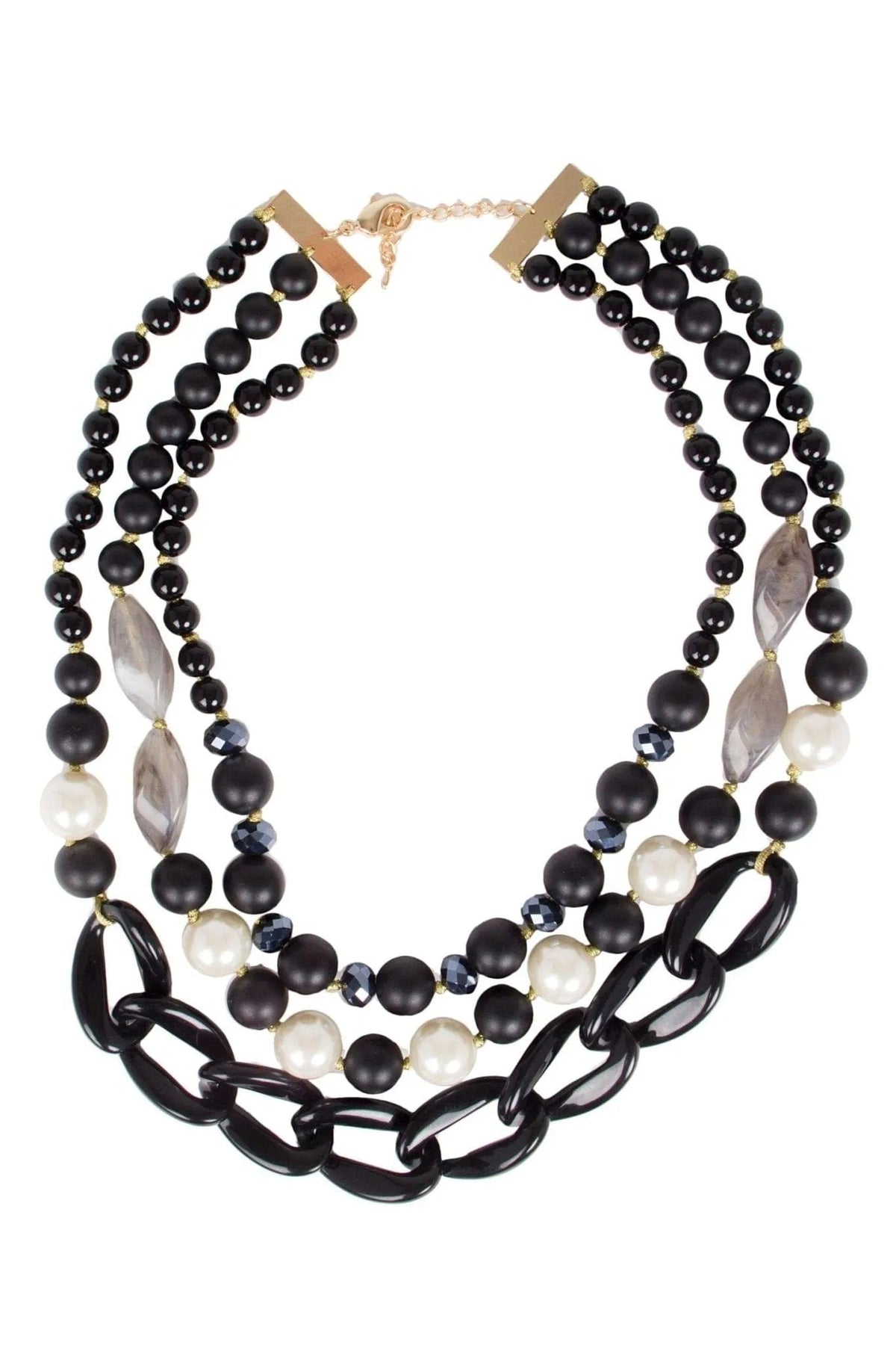 This Pearl And Bead Layered Chain Necklace by Saachi is a bold and modern take on the classic opera necklace. It features multiple strands of heavy black glass beads, white pearls, and a unique chain that can be worn long or short with its adjustable lobster clasp. This necklace makes a statement and is perfect for those who want to combine classic elegance with a modern edge.