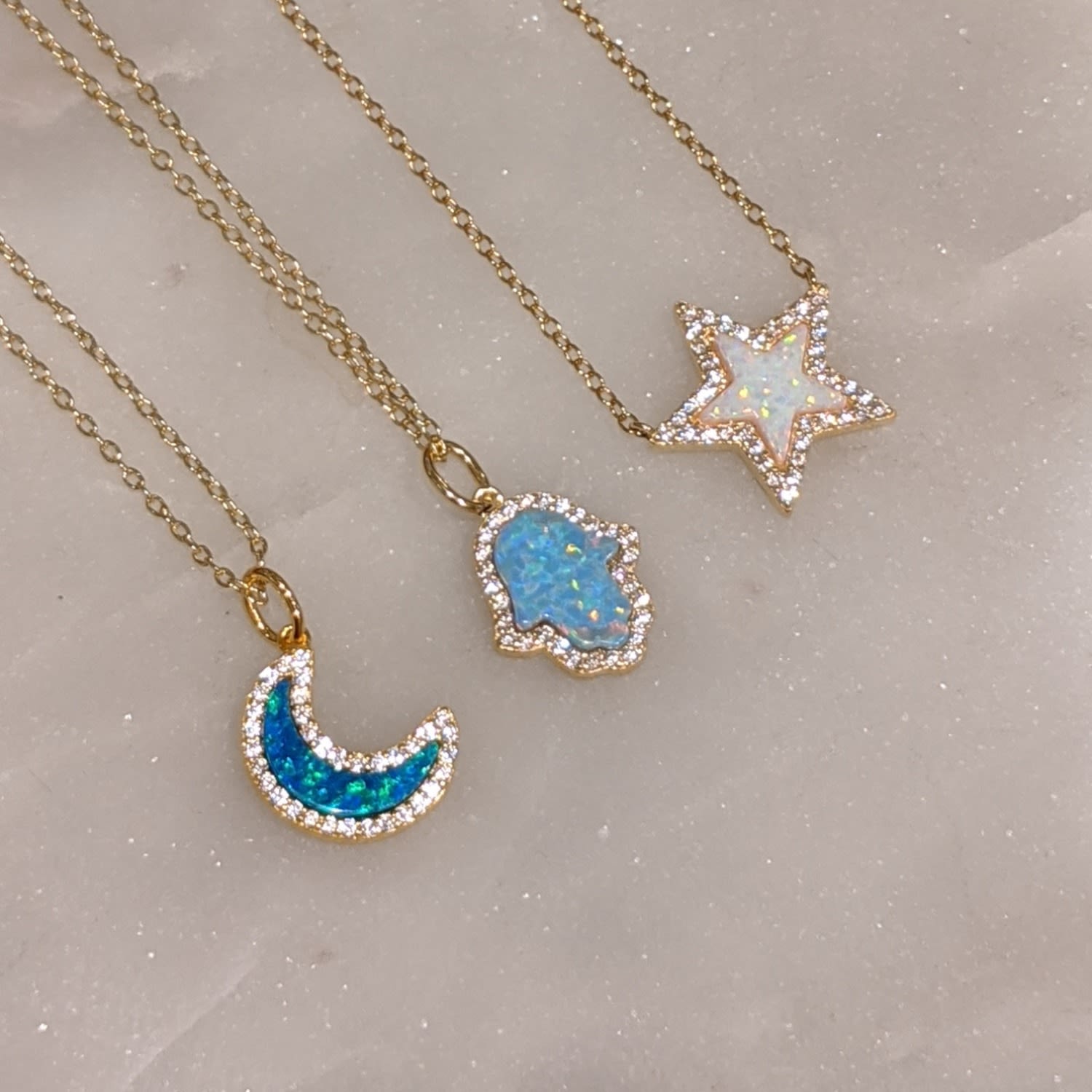 This Opal Moon Necklace by Kamaria is a delicate and meaningful accessory. It features a lab-grown blue opal moon with a crystal pave. The waning crescent moon is a reminder to surrender, rest, and prepare for new beginnings. This piece is perfect for wearing on its own or for layering. It also contributes to a good cause, as a portion of every sale supports survivors of power-inequality violence.