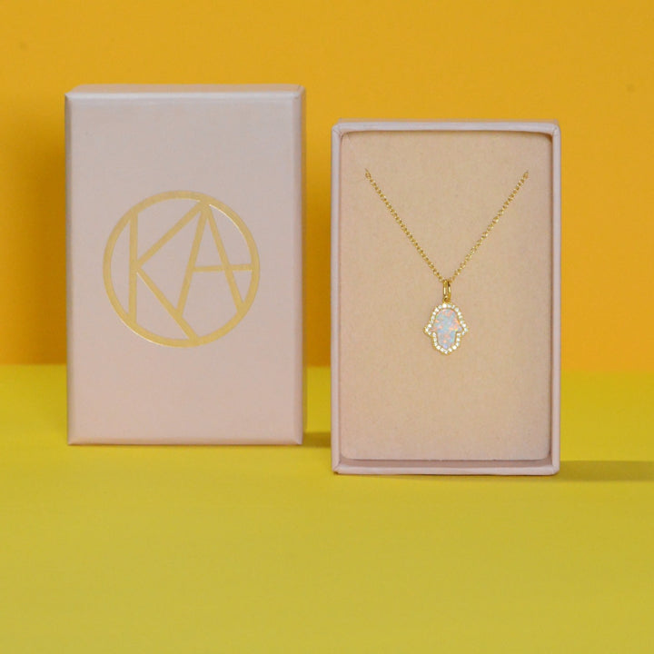 This Opal Hamsa Hand Necklace in White Opal by Kamaria is a protective talisman infused with beauty. The Hamsa, long a symbol of luck, happiness, and protection, is reimagined with white-rainbow lab-grown opal and crystal pavé. Its adjustable slider clasp allows versatile styling, while each purchase supports survivors through Restore Dignity—making it both meaningful and luminous.