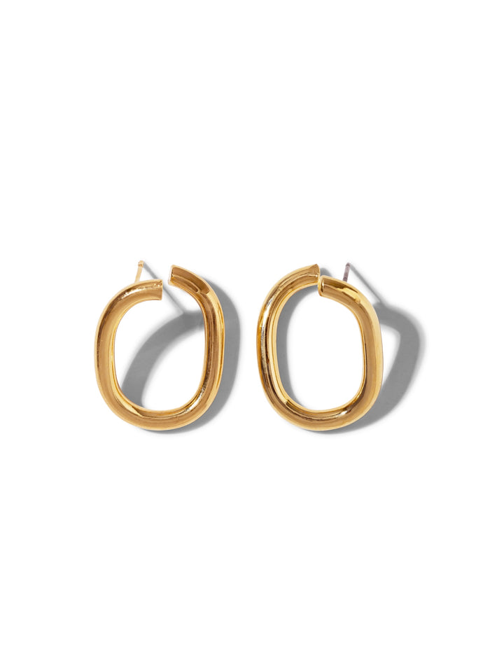 These stud earrings are lightweight and made of 18K gold-plated material with an open square oval link design.