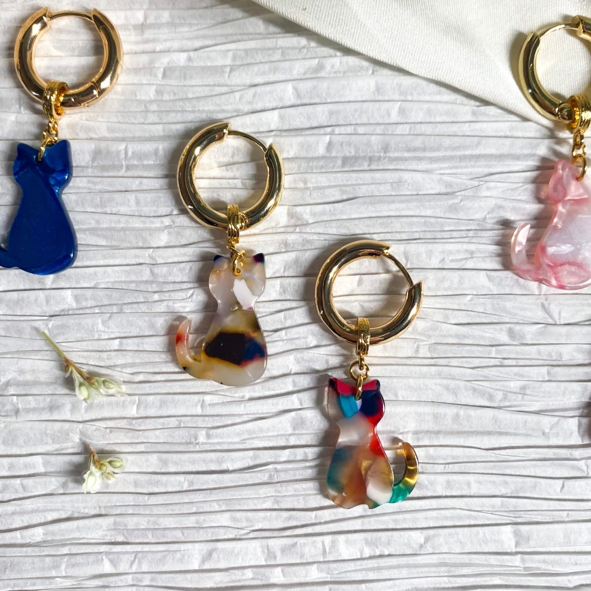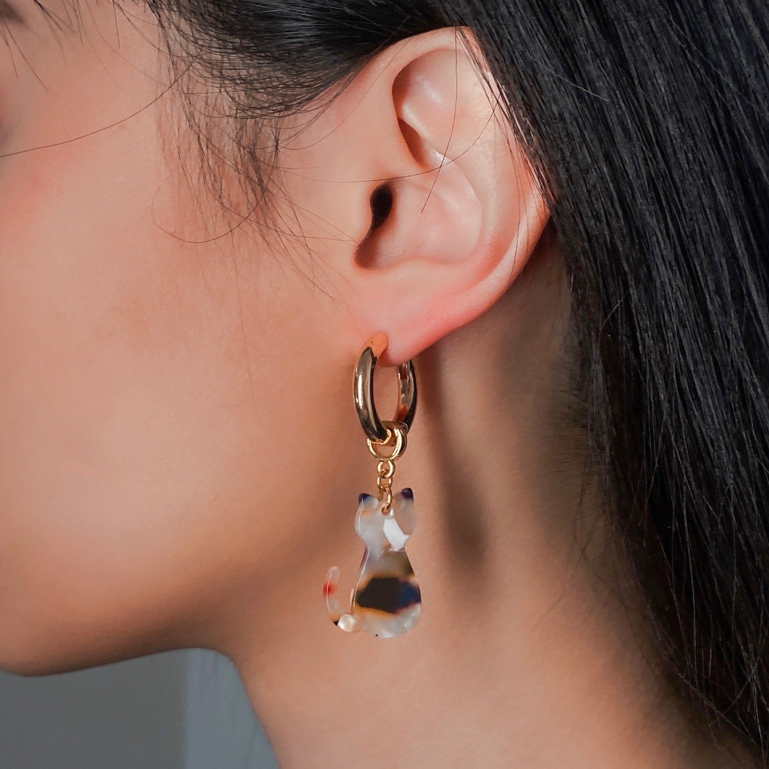 These hoop earrings and cat pendants are crafted from 14k gold plated brass. They have a cat pendant that can be worn with the hoops or separately as a necklace charm.