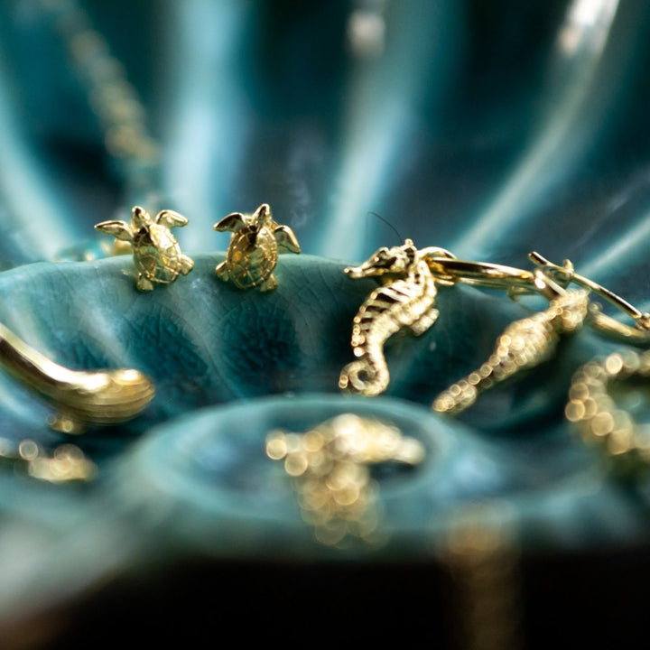 These Gold Plated Turtle Stud Earrings by Lily Charmed are the ideal accessory to add beach vibes to your jewelry collection. Crafted from sterling silver with 18ct gold plating, these friendly little turtles feature beautiful details on their shells and beaks. They are a timeless and adorable accessory that will become a new favorite. They come in a beautiful gift box, making them perfect for gifting.