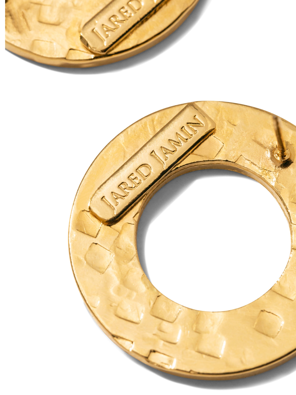 These earrings are 18K Gold Plated and have a hammered texture. They are secured with post fastenings.