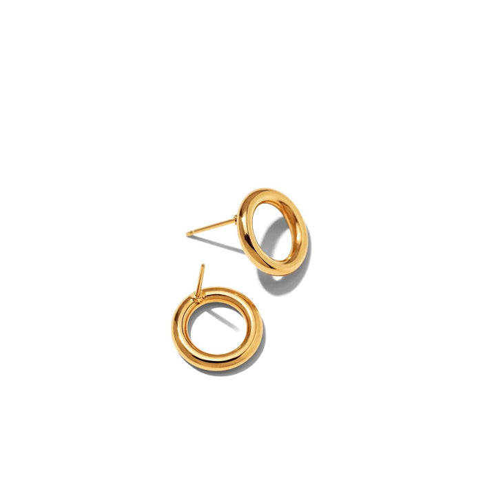 These circular post earrings are made from sleek brass with an 18K gold plate finish. Each hoop measures 0.5 inches across. Clean with a soft, dampened cloth and dry completely.