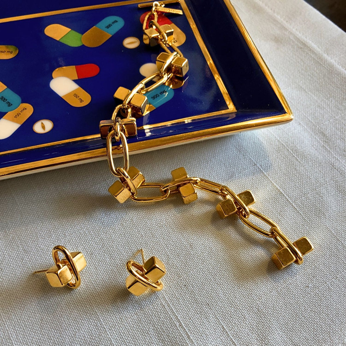 These studs are crafted from 18K gold-plated brass and measure 0.5" x 0.5". Each earring weighs 3/8 oz or 5g.