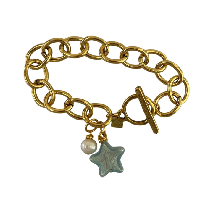 This 7.5-inch bracelet is crafted from a chunky 12k antiqued gold-plated stainless steel chain with a mini 12k antiqued gold-plated pewter toggle clasp. It features a Murano glass star and a freshwater pearl.