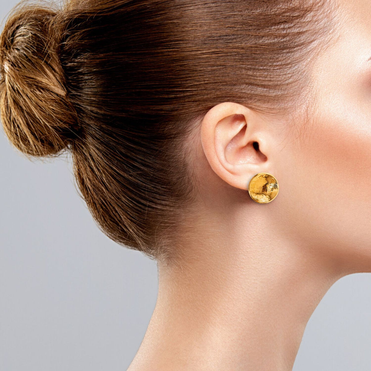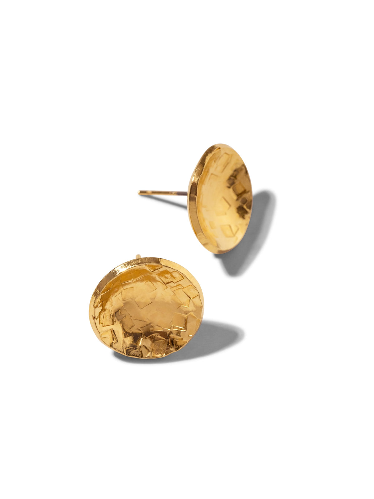 These Gold Buttercup Textured Stud Post Earrings by Jaredjamin are a dazzling accessory that will instantly light up your lobes. Crafted with 18K gold-plated brass, they feature a unique concave shape and a mesmerizing reflective depth that catches the light beautifully. The intricate texture and design give these post earrings a sophisticated and elegant look. They are the perfect accessory to elevate any style and are sure to be a conversation starter.