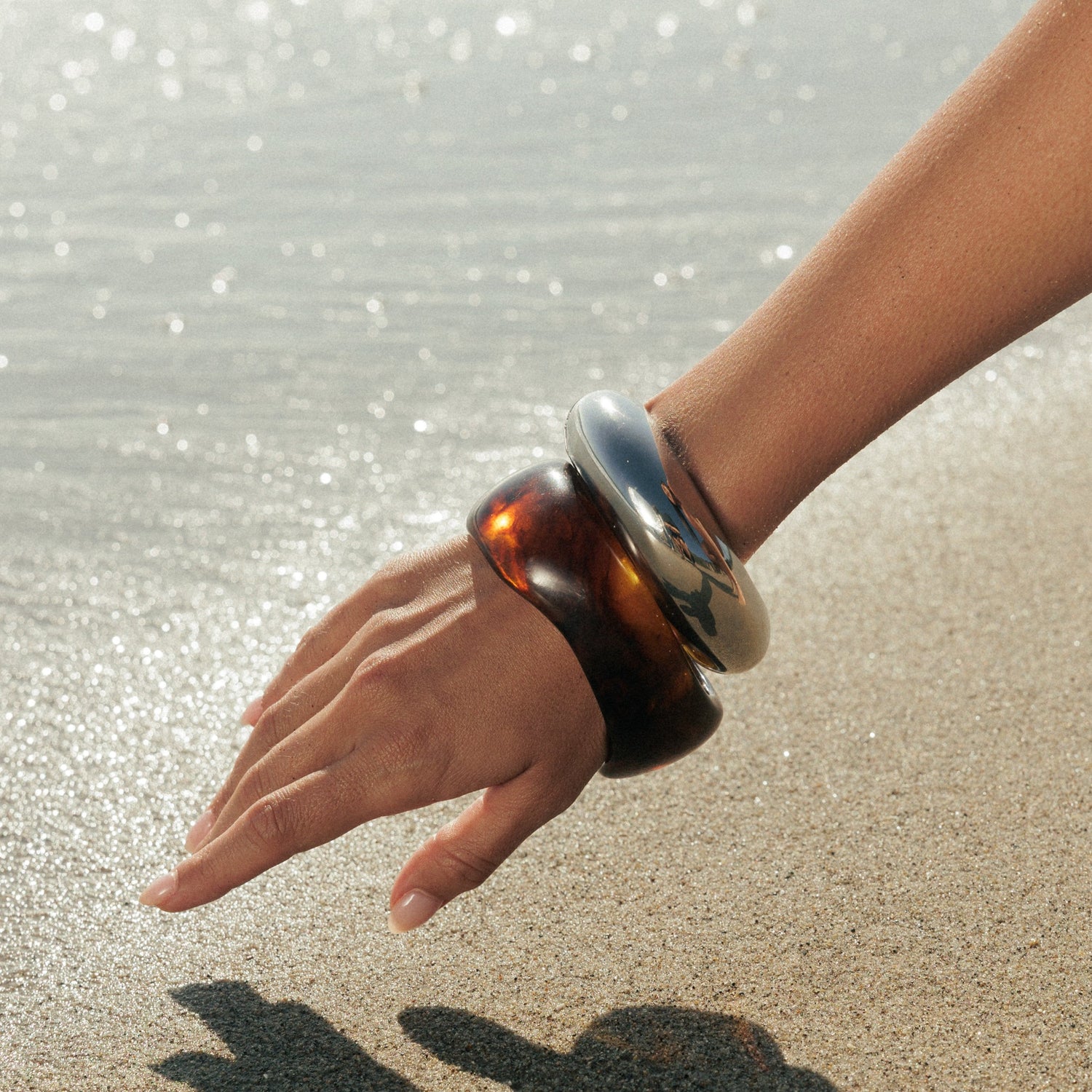 This Notte Bangle Set by Mg Jewelry is a timeless and versatile accessory designed to add a refined charm to any ensemble. The chunky bangles feature a sophisticated blend of silver and resin, creating a modern, artistic look. Their adaptable style is ideal for stacking with other bracelets or wearing alone for a clean, bold statement. These bangles are an essential accessory that seamlessly suits every event, from a casual day out to a more formal gathering.
