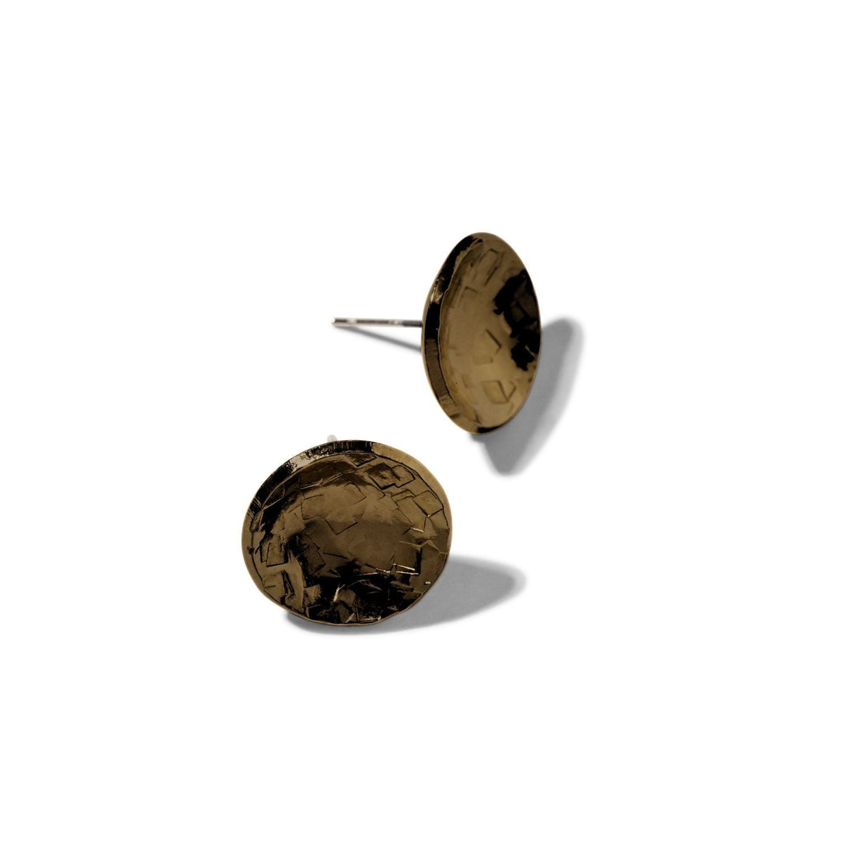 These post earrings are crafted from brass with an antique finish and a hammered texture. They measure 17mm and are designed for pierced ears.