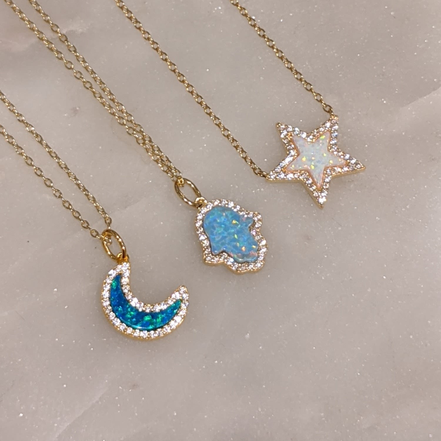 This necklace is made with a lab-grown white opal with a crystal pave. It is made of 14k gold-plate over 925 sterling silver.