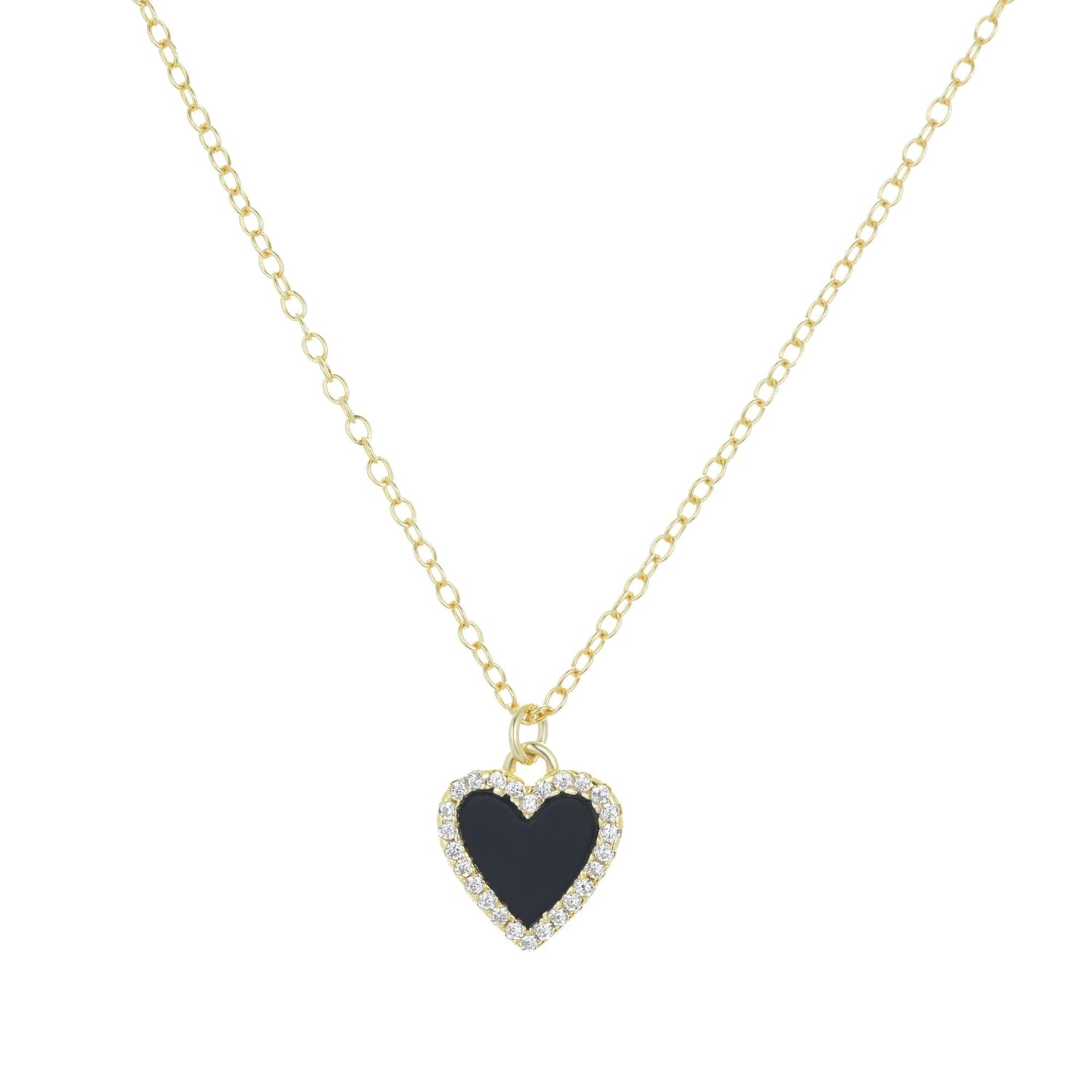 This Mini Black Onyx Heart Necklace With Crystals by Kamaria is a charming and delicate accessory. This necklace features a lab-created black onyx heart surrounded by sparkling crystals. It is set in 925 sterling silver and plated in gold. The chain is adjustable from choker length to 18 inches, making it a versatile piece for everyday wear or layering.