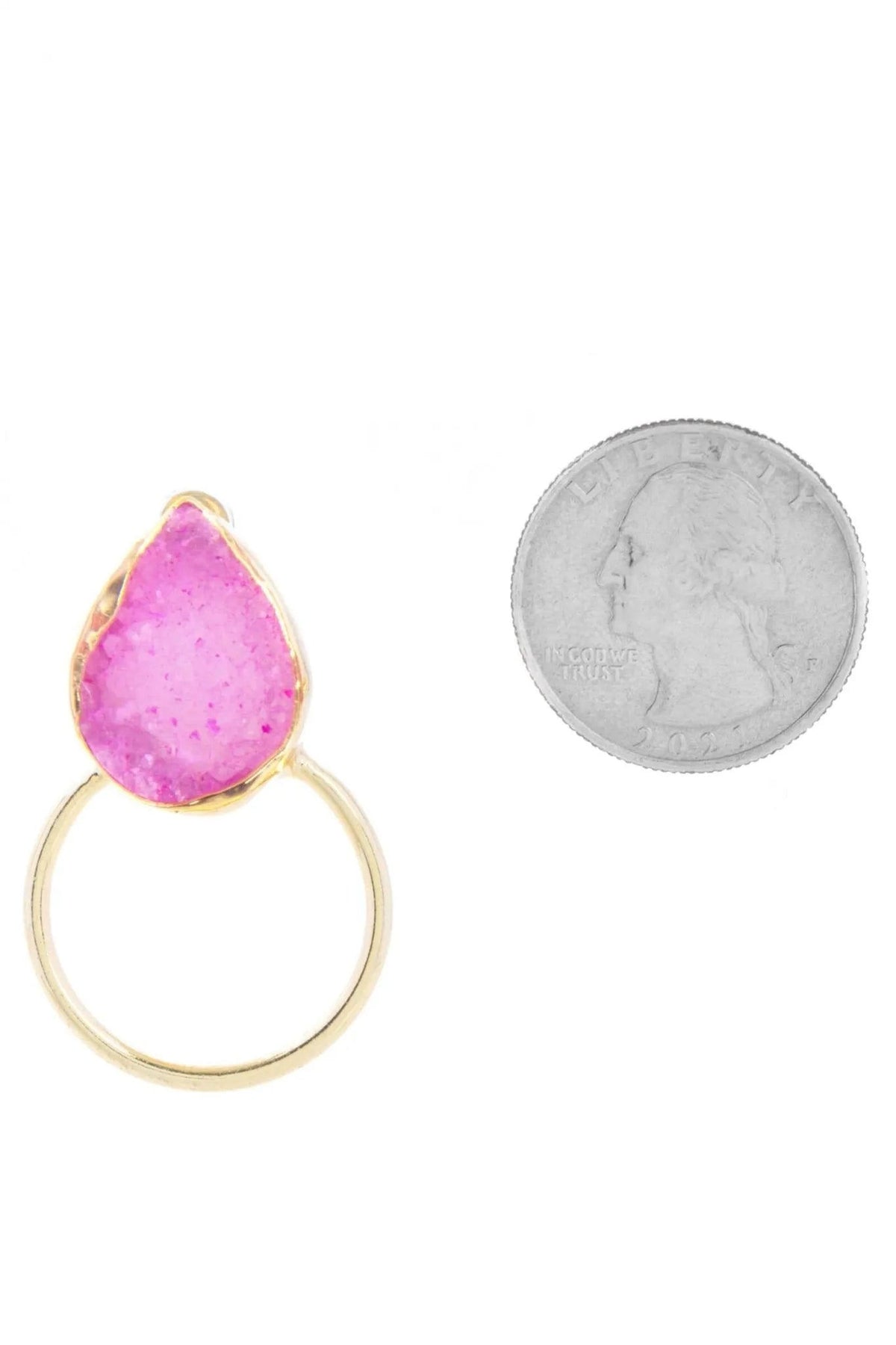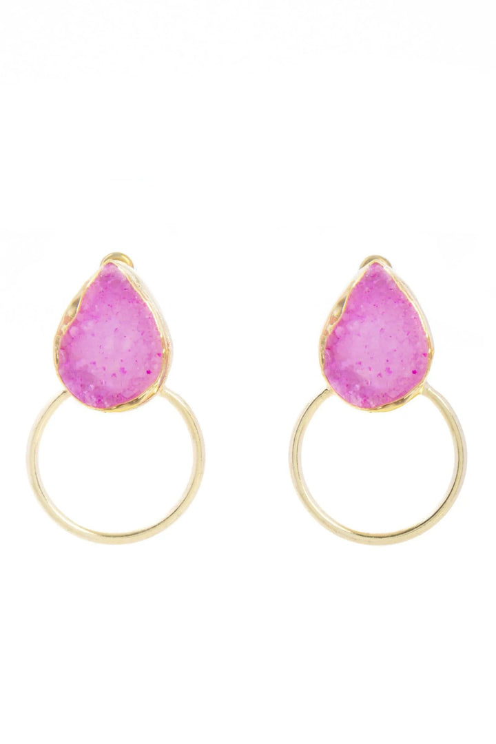 These earrings are made from 18K Gold-Plated Brass and are adorned with Agate Druzy stones. They measure 1.5" x 0.90" and have a post back.