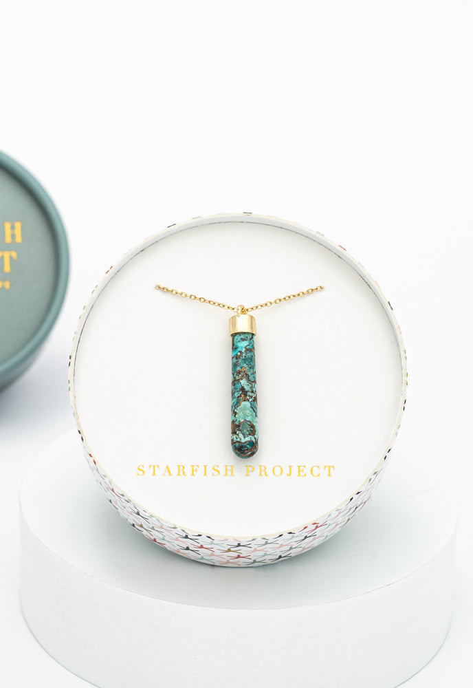 This Resilience Necklace In Turquoise by Starfish Project is a meaningful symbol of strength and serenity. A turquoise pillar pendant dipped in gold radiates calm while representing resilience and support. More than jewelry, it carries a mission—empowering survivors through every purchase.