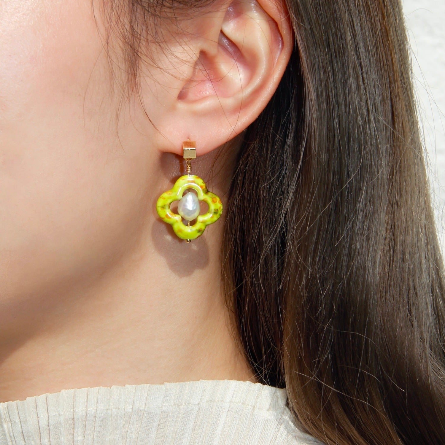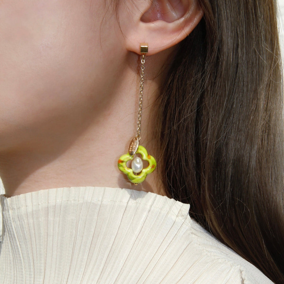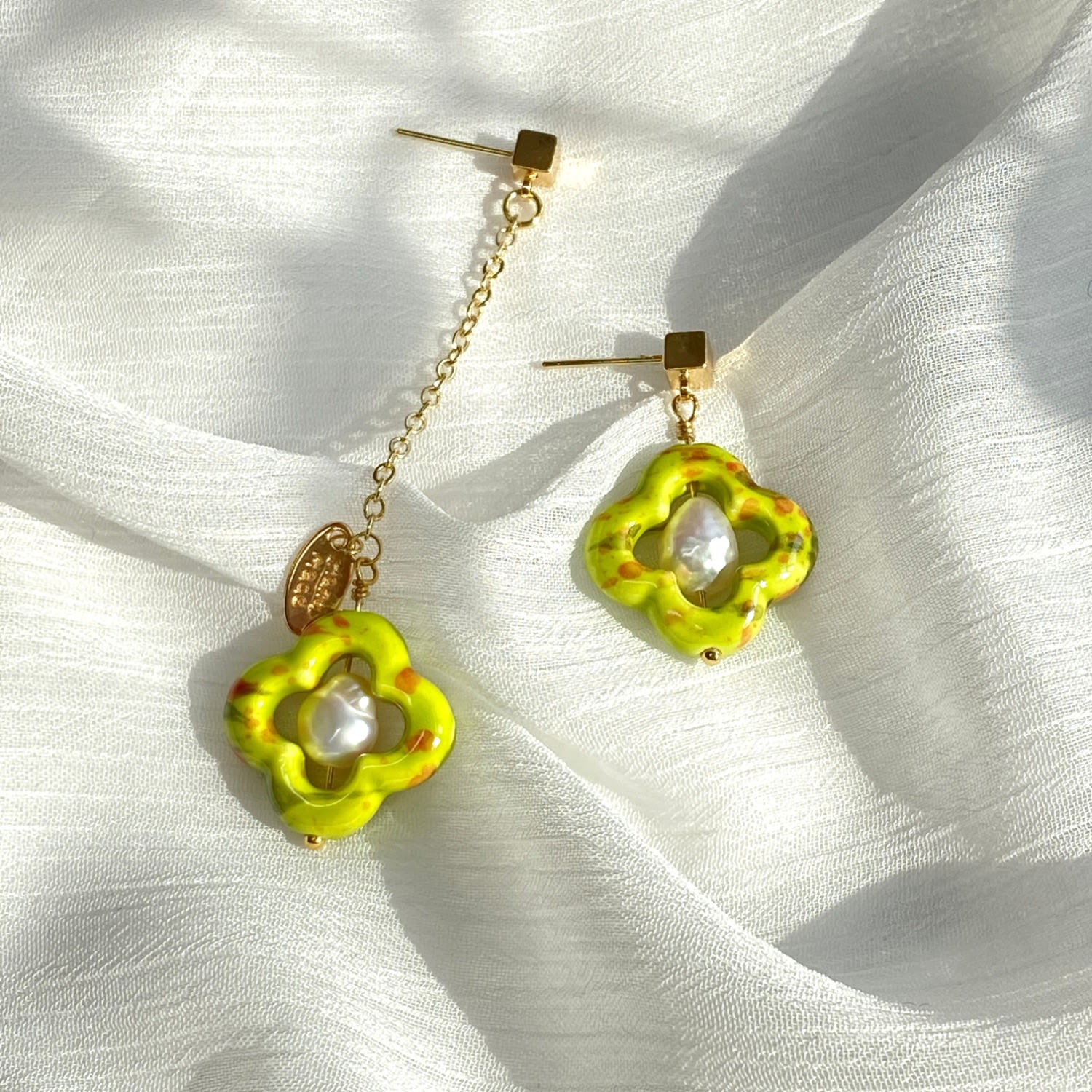 These handmade earrings are crafted from 14K gold-plated brass. They feature a ceramic clover, freshwater pearl, and sterling silver studs. The design is asymmetrical with looping chains.