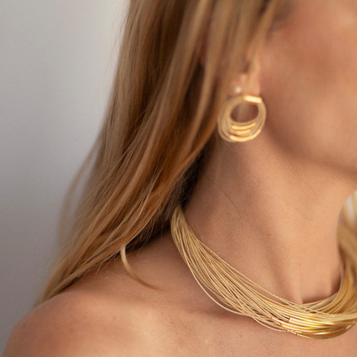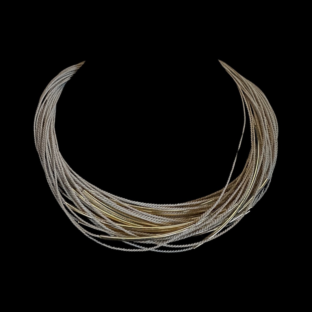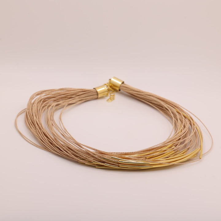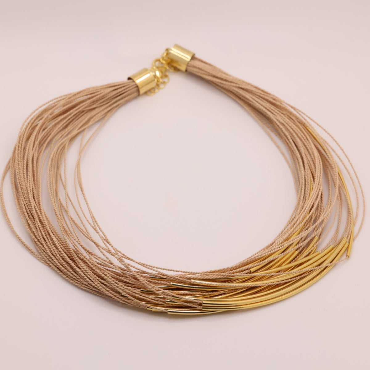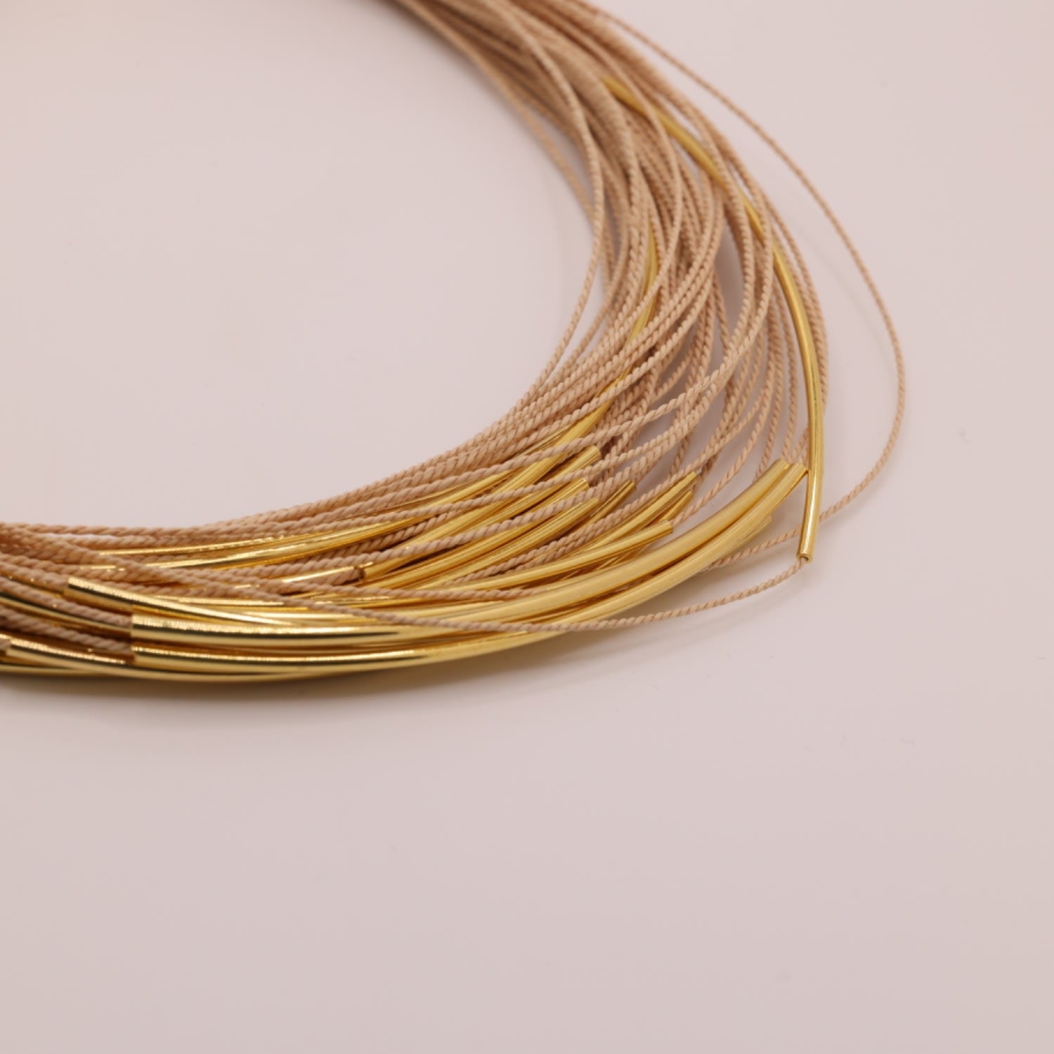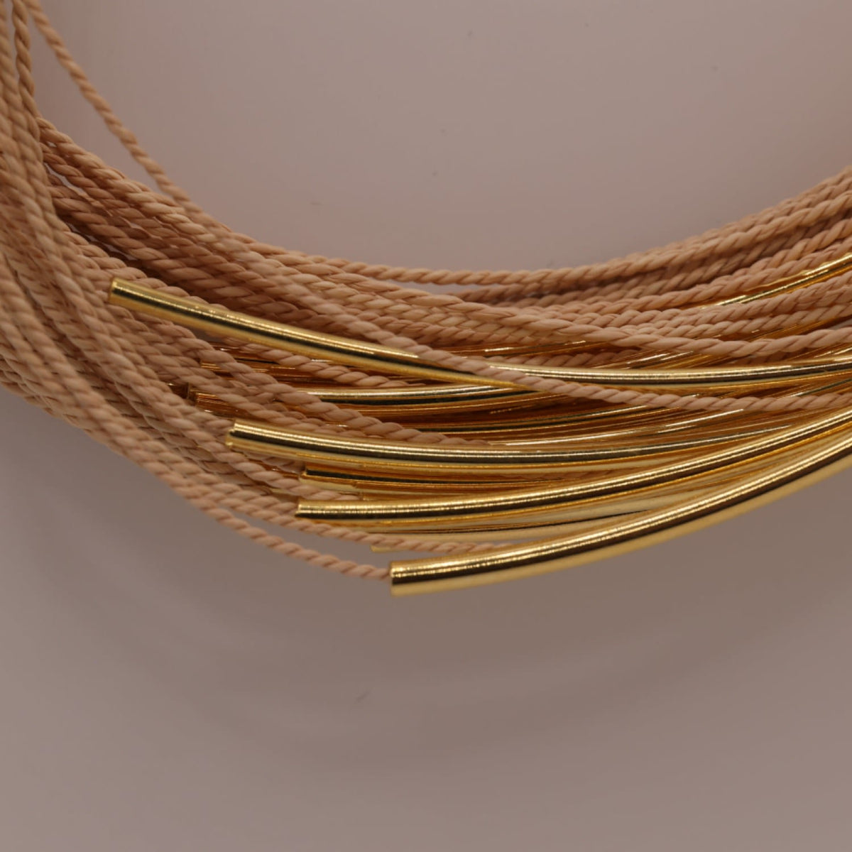 This The Multiple Buriti Natural Fiber Necklace by Nart Nature Making Art is a beautiful and full statement piece. It is crafted with 50 strands of buriti fiber and gold-plated findings, creating a necklace that can also be worn as a choker. This necklace is perfect for enhancing your look with a touch of natural beauty and elegant craftsmanship.