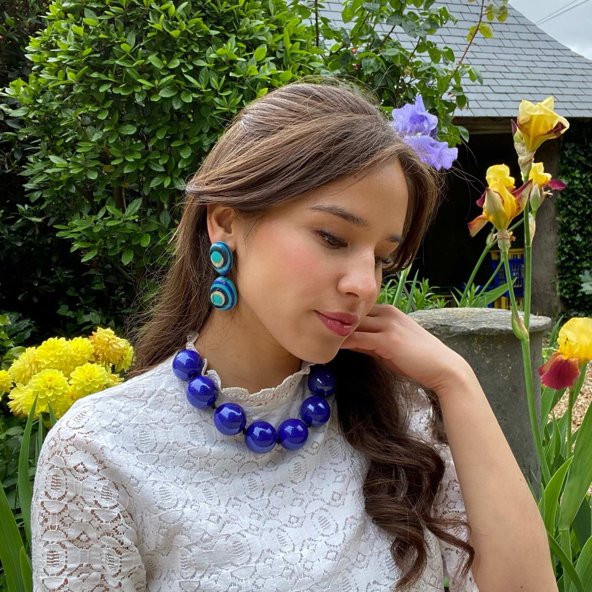 These drop earrings are crafted from lightweight resin in navy, turquoise, black, and ivory hues.