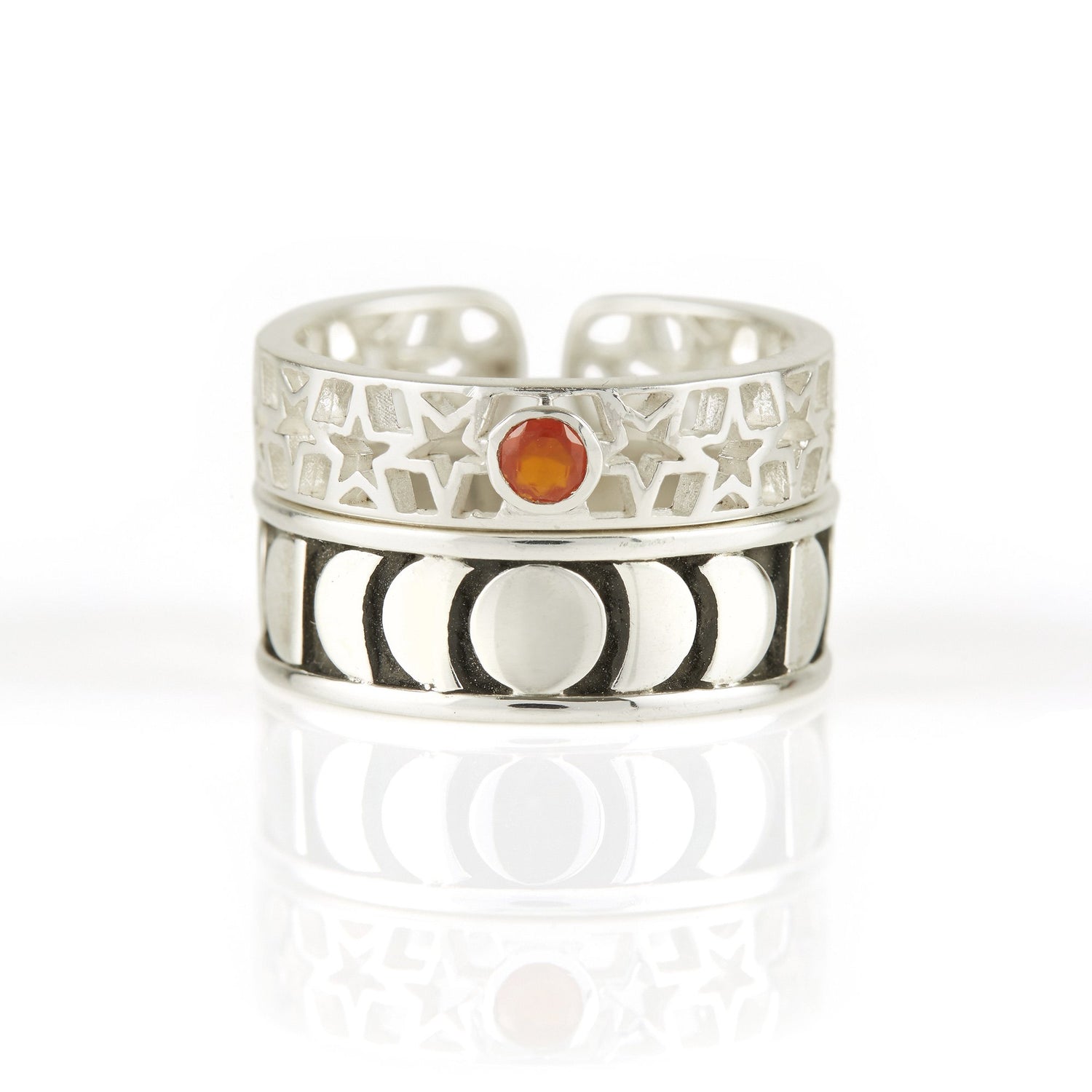 This Amber Star Silver Adjustable Midi Ring or Toe Ring by Charlotte’s Web Jewellery is inspired by Jaipur’s Amber Fort. Its silver band is adorned with delicate star cut-outs and a glowing carnelian gemstone, symbolising motivation and vitality. Adjustable and versatile, it can be worn as a midi or toe ring, bringing bohemian charm to any look.