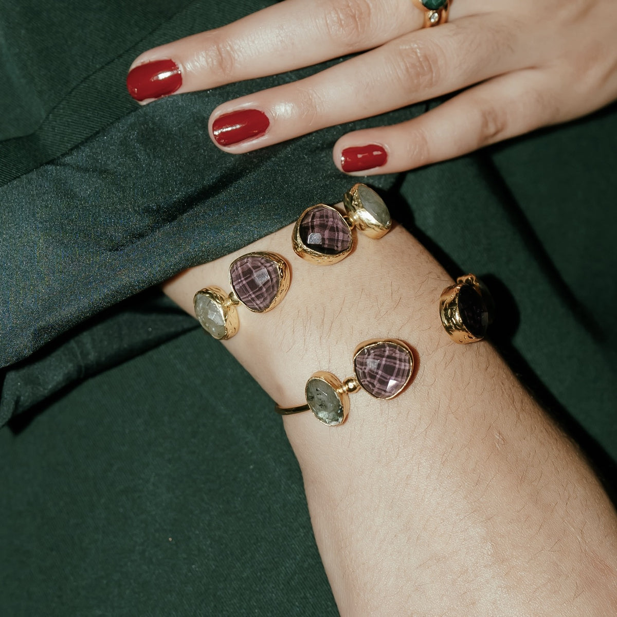 This Seyyal Cuffs by Rōz is a rich and elegant accessory that gives off luxury vibes. The two-toned, four-stoned cuff features labradorite and amethyst gemstones. This adjustable cuff is made from 21k gold-plated brass with a lacquer coating for protection. Its design is perfect for making a bold statement.