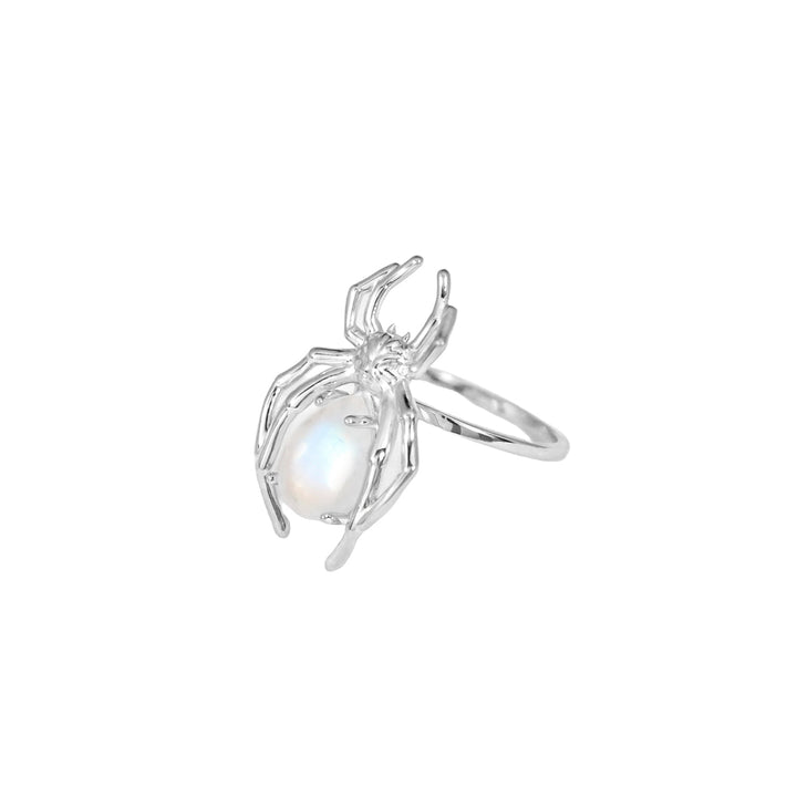 This Silver Spider & Moonstone Stacking Ring by Marie June Jewelry combines mystical symbolism with refined craftsmanship. The spider motif, representing creativity and protection, is paired with a glowing natural moonstone cabochon, long associated with intuition, balance, and new beginnings. Designed for stacking, it layers beautifully with other rings while remaining equally powerful as a solo statement, blending ethereal charm with modern minimalism.