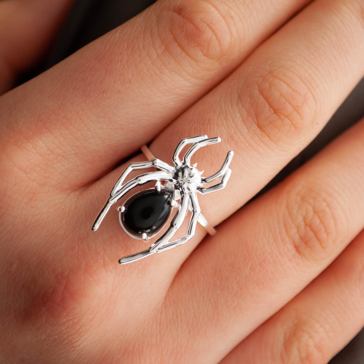 This Silver Spider & Black Onyx Stacking Ring by Marie June Jewelry combines gothic elegance with meaningful symbolism. The spider, representing creativity, patience, and protection, is paired with a natural pear-shaped black onyx cabochon — a gemstone of strength, grounding, and resilience. Perfect for stacking or wearing solo, this piece brings both mystique and power to any collection.