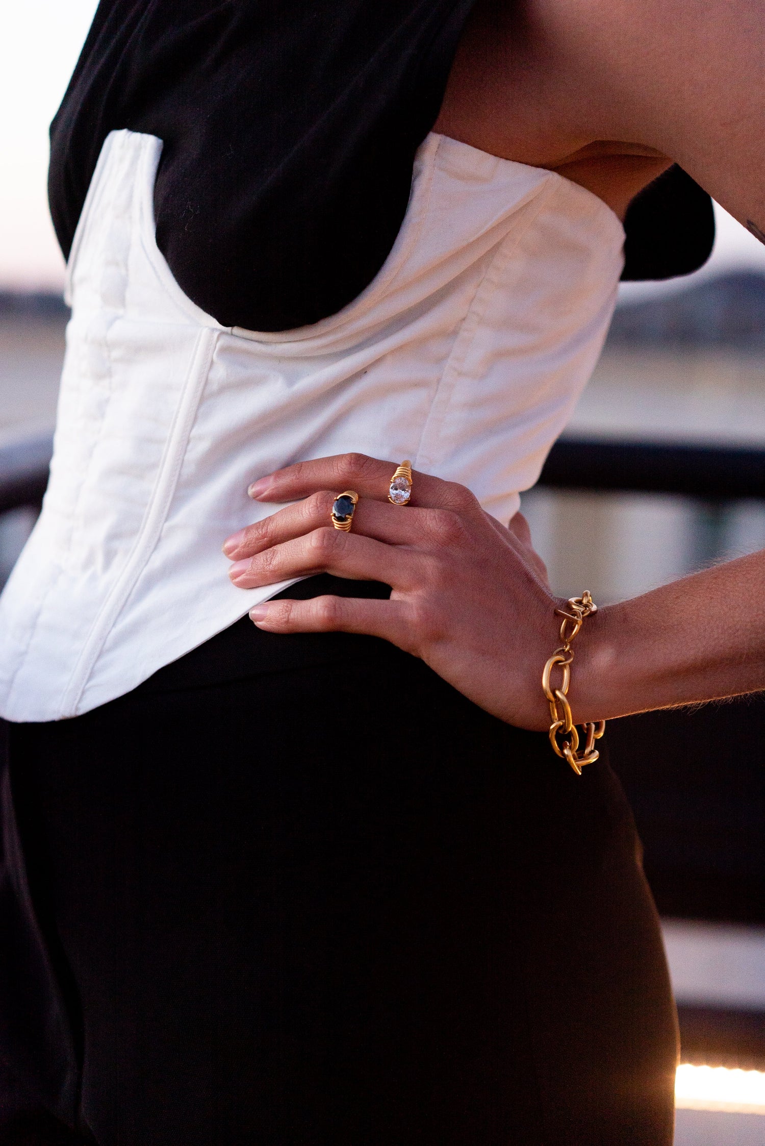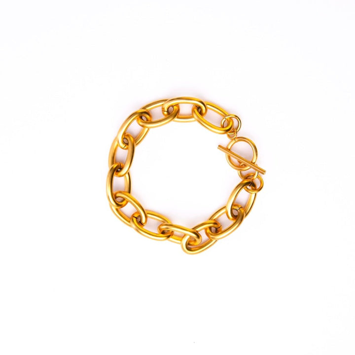 This bracelet is crafted from 18k gold-plated stainless steel.