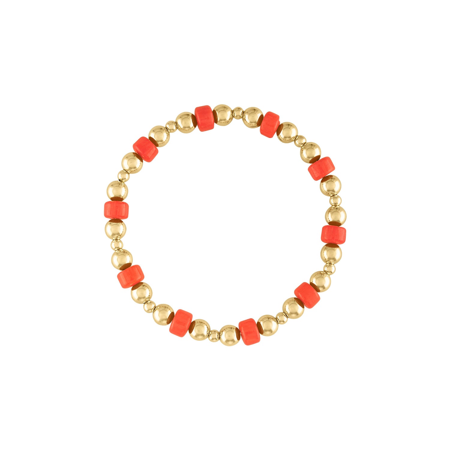 This Flora Coral Heishi Bracelet by Olivia Le is a bolder version of the mini Flora, designed to make a statement with larger beads. It features 3mm and 5mm gold-filled beads along with 6mm Coral Heishi Beads. The stretch design makes it comfortable and easy to wear. This bracelet is a beautiful blend of coral and gold, perfect for adding a pop of color and a sophisticated touch to your look.
