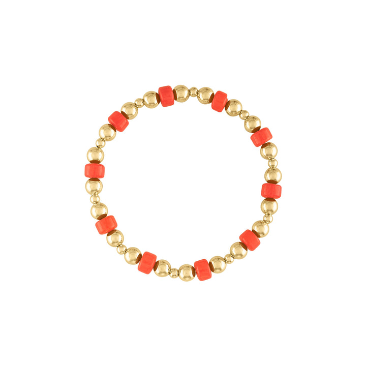 This bracelet is handmade with 3mm and 5mm gold-filled beads and 6mm Coral Heishi Beads. It is available in a 6.5'' stretch design.
