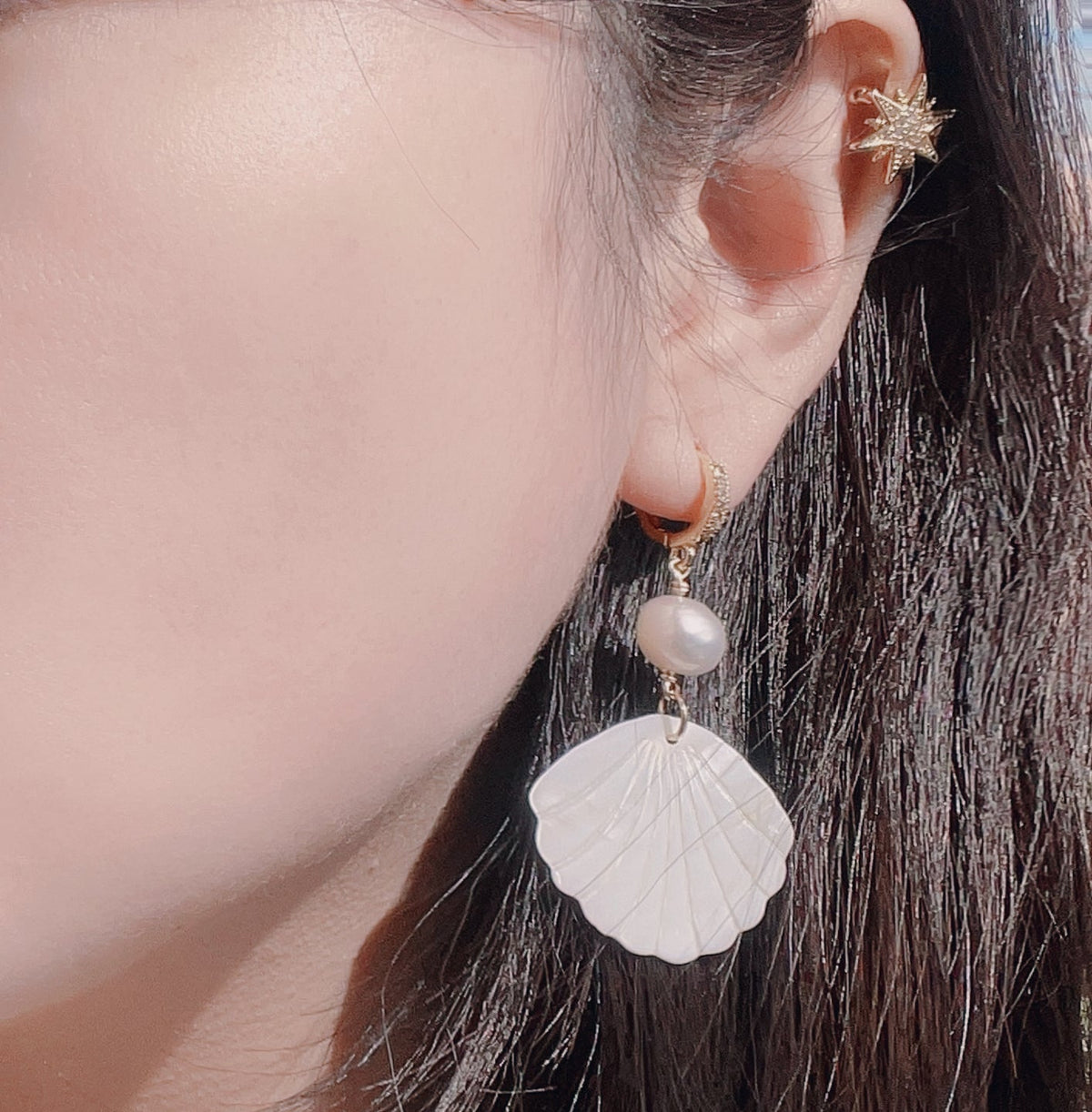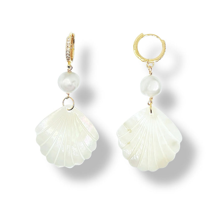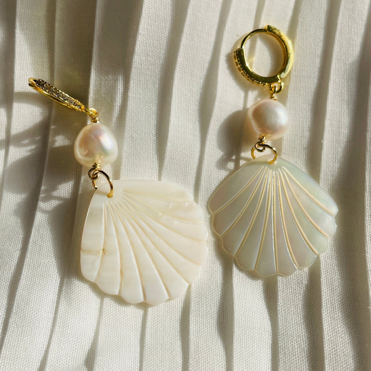 Crafted from 14K gold-plated brass, these earrings feature a unique dangling design with baroque pearls, shells, and zirconia stones. The materials are eco-friendly and designed to minimize allergic reactions.
