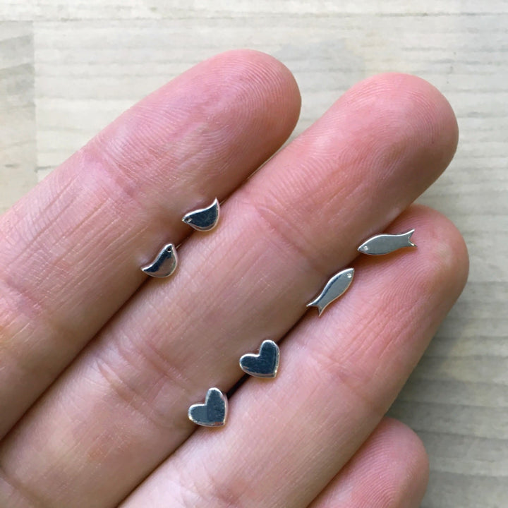 These Mini Fish Stud Earrings by Lime Tree Design are delicate and elegant. The miniature fish design is perfect for upper or mid-ear piercings, offering a plain and simple look. These sterling silver earrings are a subtle and charming accessory for everyday wear.