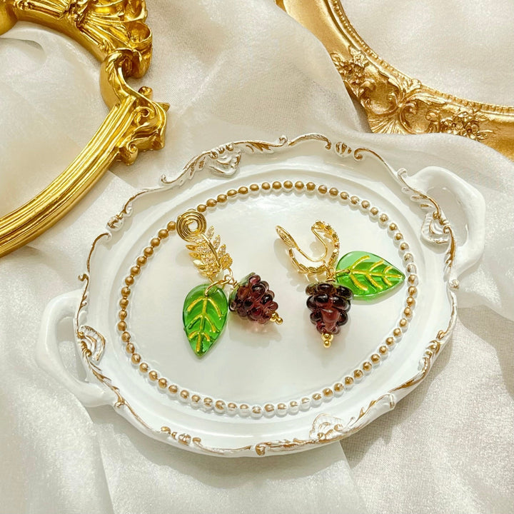 These Eden's Berry Clip On Earrings by Ninemoo are a sweet and delicate accessory. They feature little glass berries that hang from gold-plated zircon leaf-shaped clips. These clip-on earrings are designed to provide a comfortable fit with silicone pads, and their gentle swaying movement adds a touch of color and sweetness to your summer look.