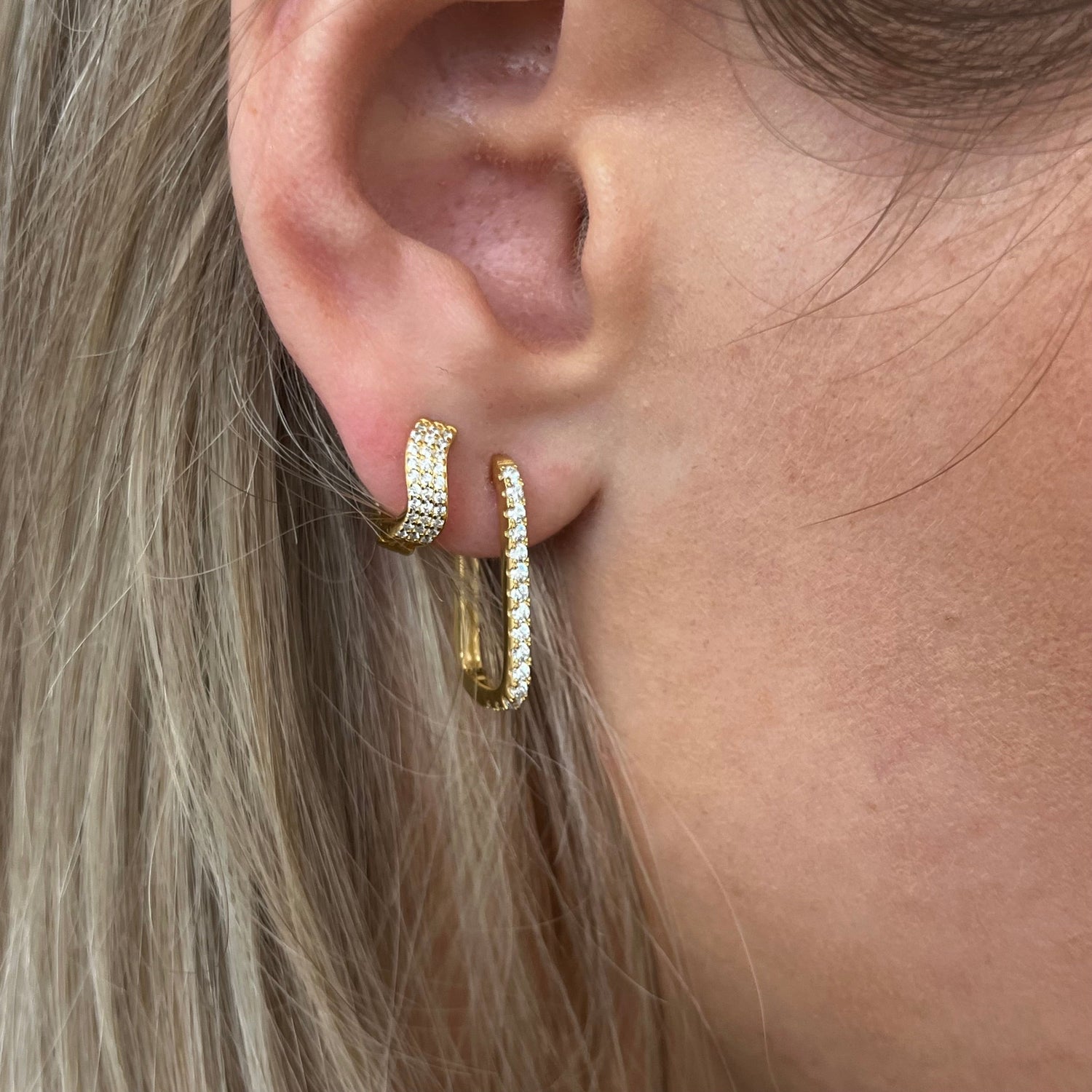 The Pavé Gold Wave Huggie Mini Earrings by Nazzar sparkle with sculptural fluidity. Their wave design encrusted with CZ stones creates a chic shimmer perfect for the cartilage area or as an everyday huggie. Modern, glamorous, and waterproof for effortless daily wear.