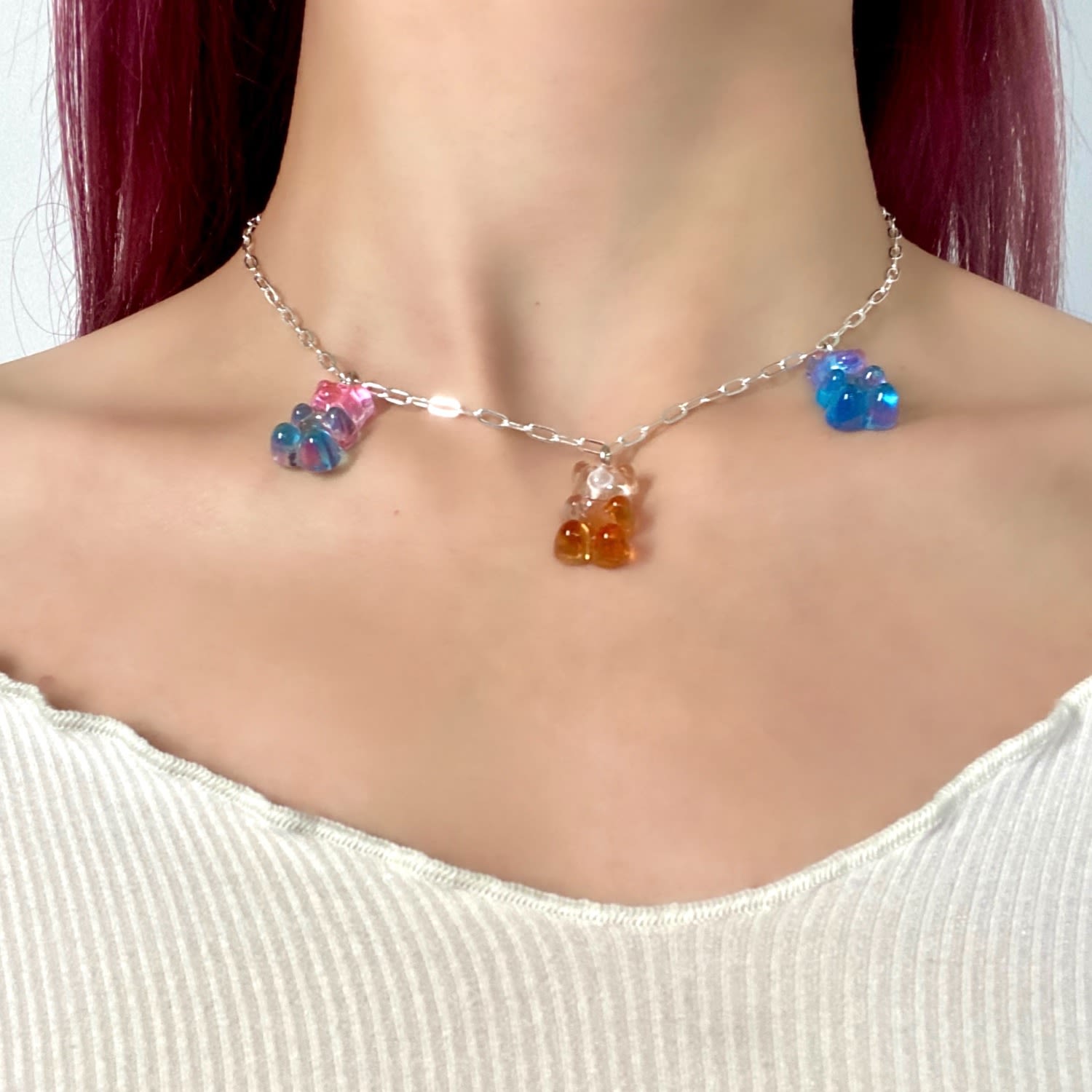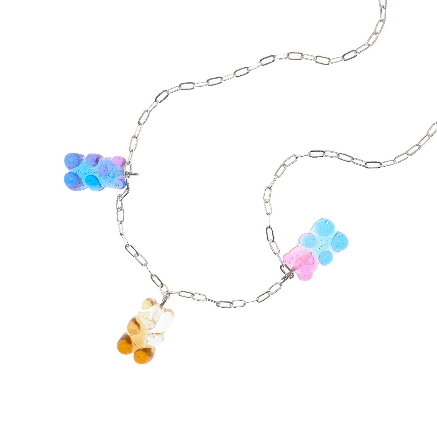 This necklace is made with a silver-plated brass chain and resin gummy bear pendants. It has an adjustable extension chain.