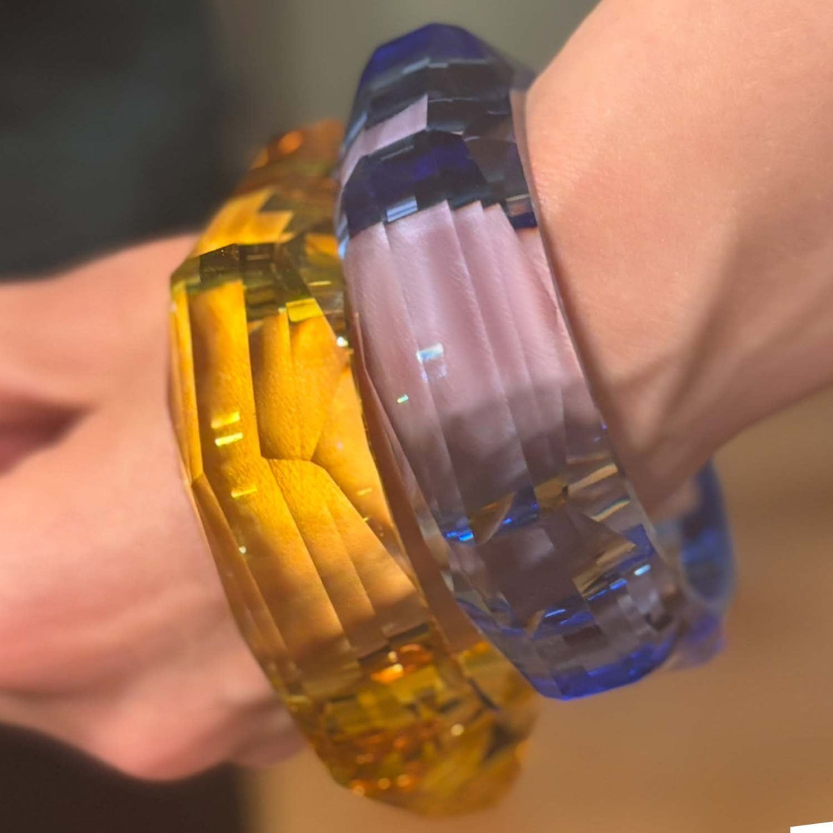 This bangle is made from faceted acrylic in an amethyst color.