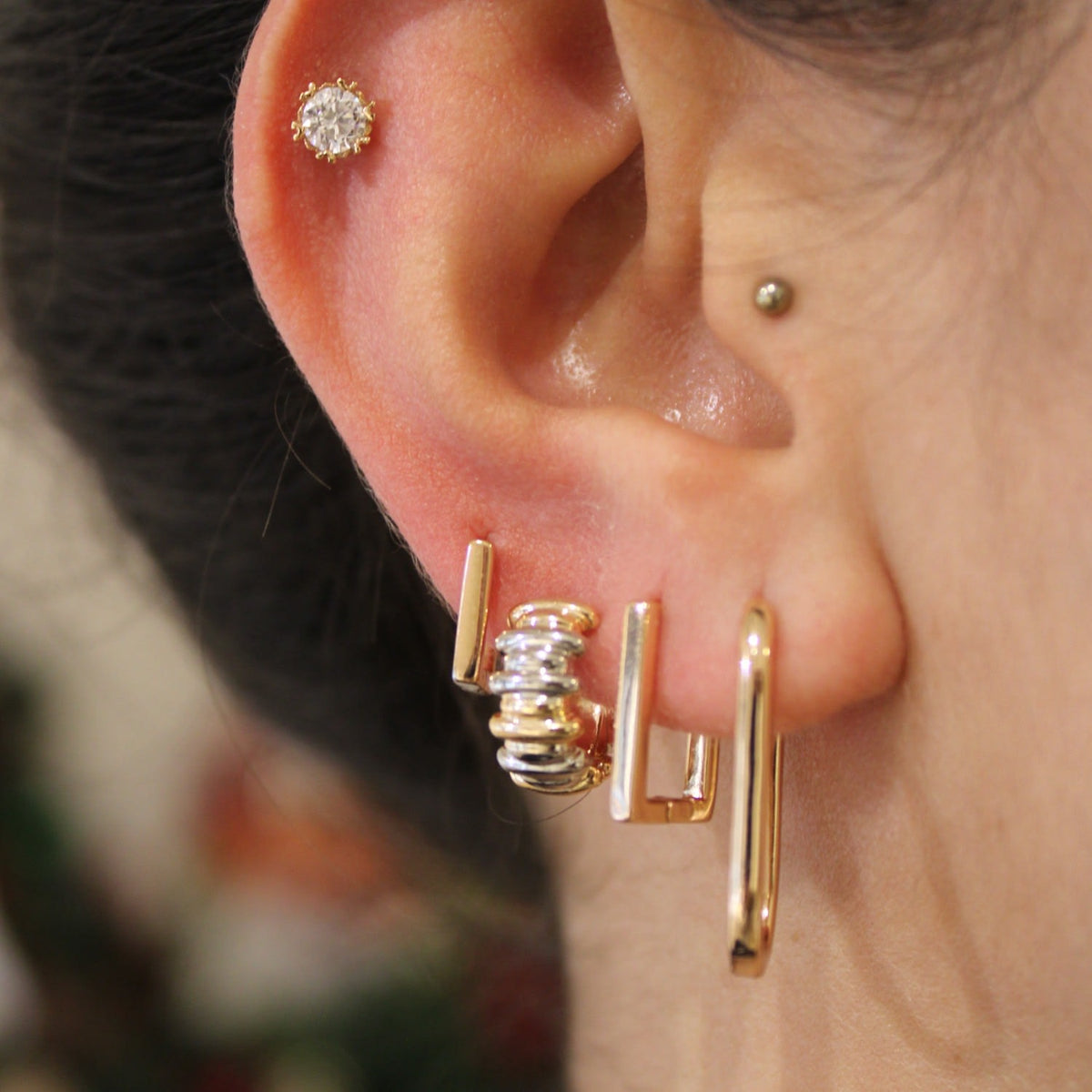 These hoop earrings are crafted from sterling silver and are rhodium plated. They are hypoallergenic, tarnish-resistant, and waterproof.