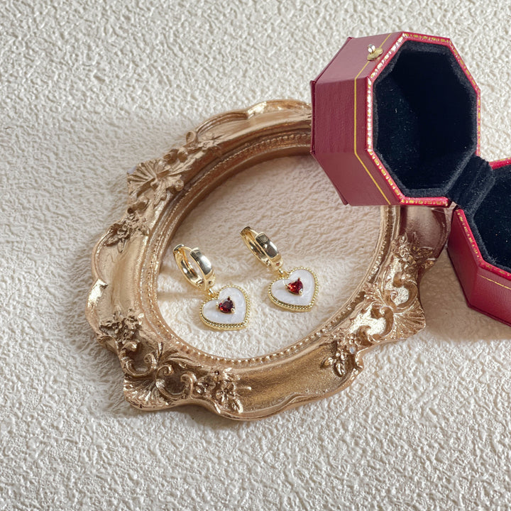 The material for these earrings is not specified beyond being "gold". They feature a heart-shaped hoop design.