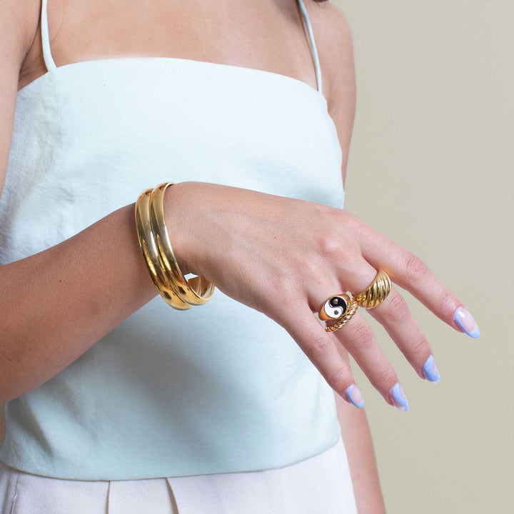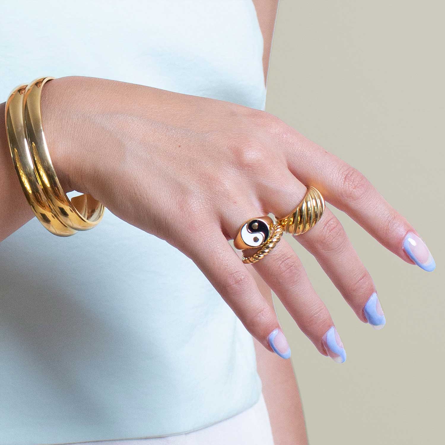 This Yin Yang Gold Ring by Outofoffice is a timeless symbol of harmony, balance, and duality. Crafted in high-quality gold, it embodies the dance between opposing forces: light and dark, strength and softness. This waterproof and tarnish-free ring is a perfect daily reminder of your inner equilibrium or a meaningful statement piece. Its minimal design and deep intention make it a versatile accessory that blends elegance with personal significance.