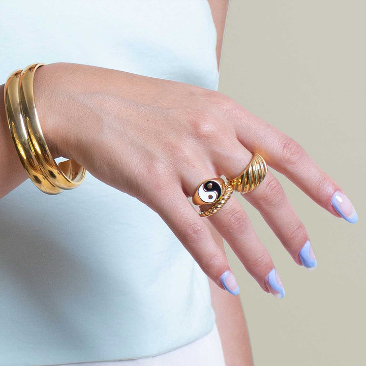 This ring is crafted from high-quality, waterproof, and tarnish-free gold. It features a yin-yang symbol.