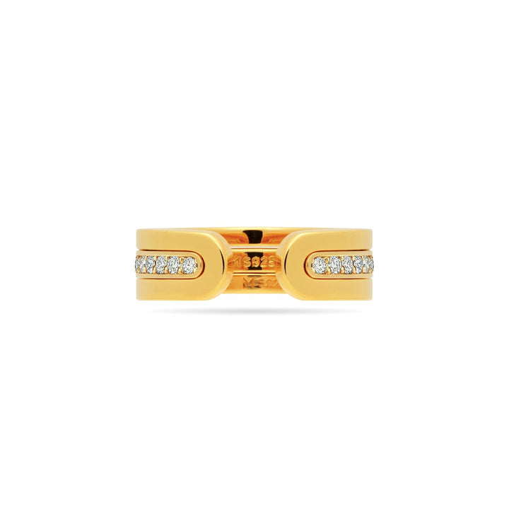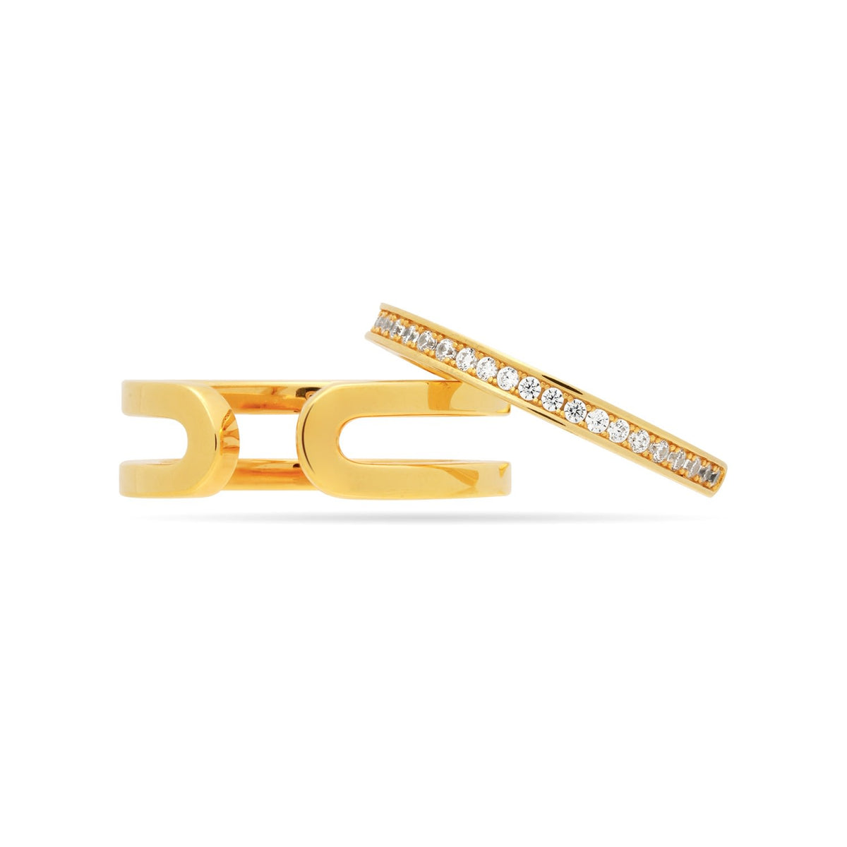 The Modular Thin Band Ring Set With Pave Cz - Gold by Meulien is a versatile and elegant accessory. This modular ring set is made of 18K vermeil and features pave CZ. It includes an open-ended double thin band and a separate single thin band that can be worn in five different ways. The set offers a variety of styling options, from a classy to a trendy look.